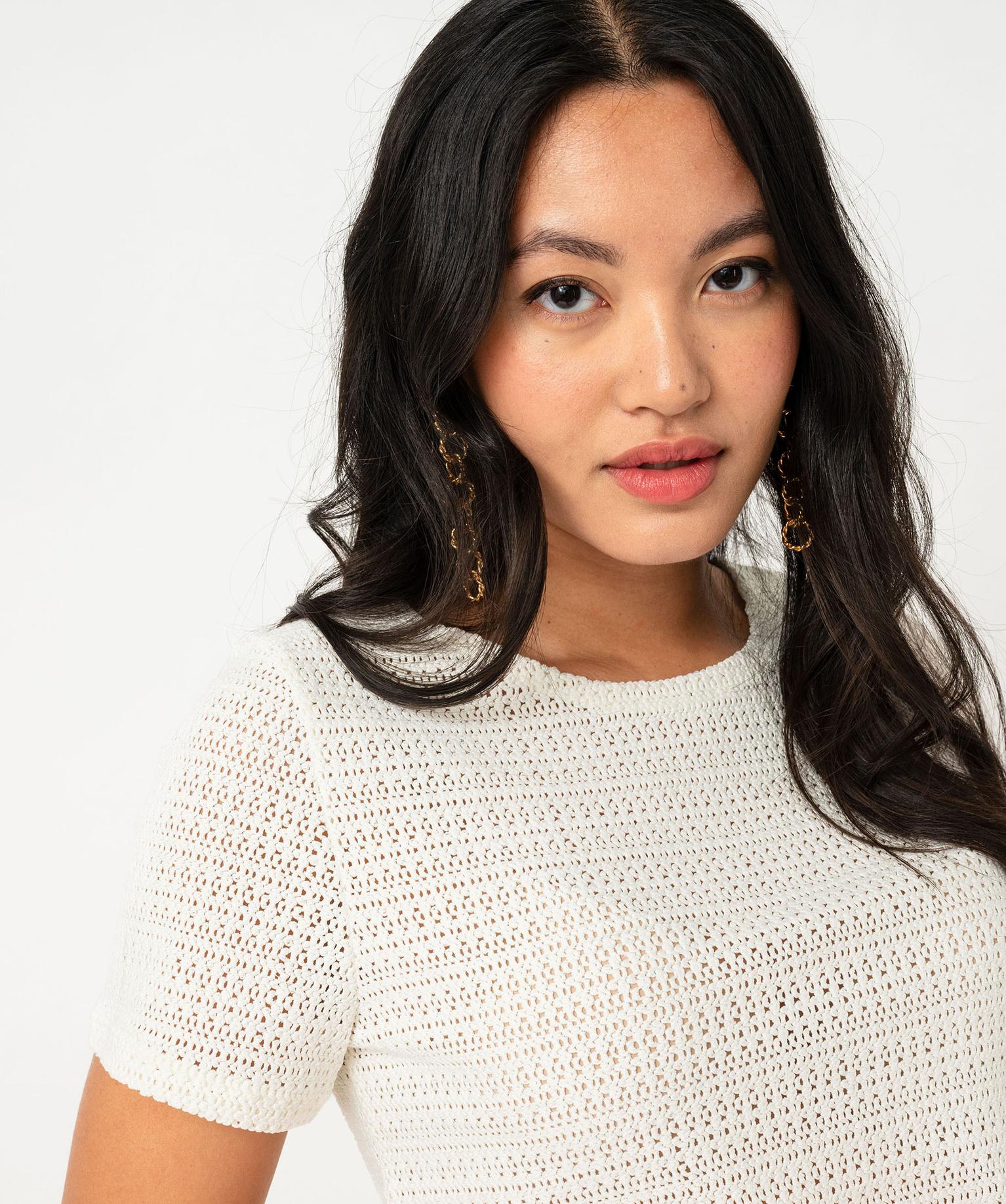 Le tee-shirt à manches courtes réinventé dans une sublime maille ajourée esprit crochet au toucher ultra doux. Un tee-shirt femme doté d’un large col rond qui sublime le décolleté et d’une coupe droite sobre et élégante. Ce tee-shirt en maille ajourée se porte sur un top à bretelles ou sur un joli soutien-gorge bustier offrant un joli jeu de transparence.