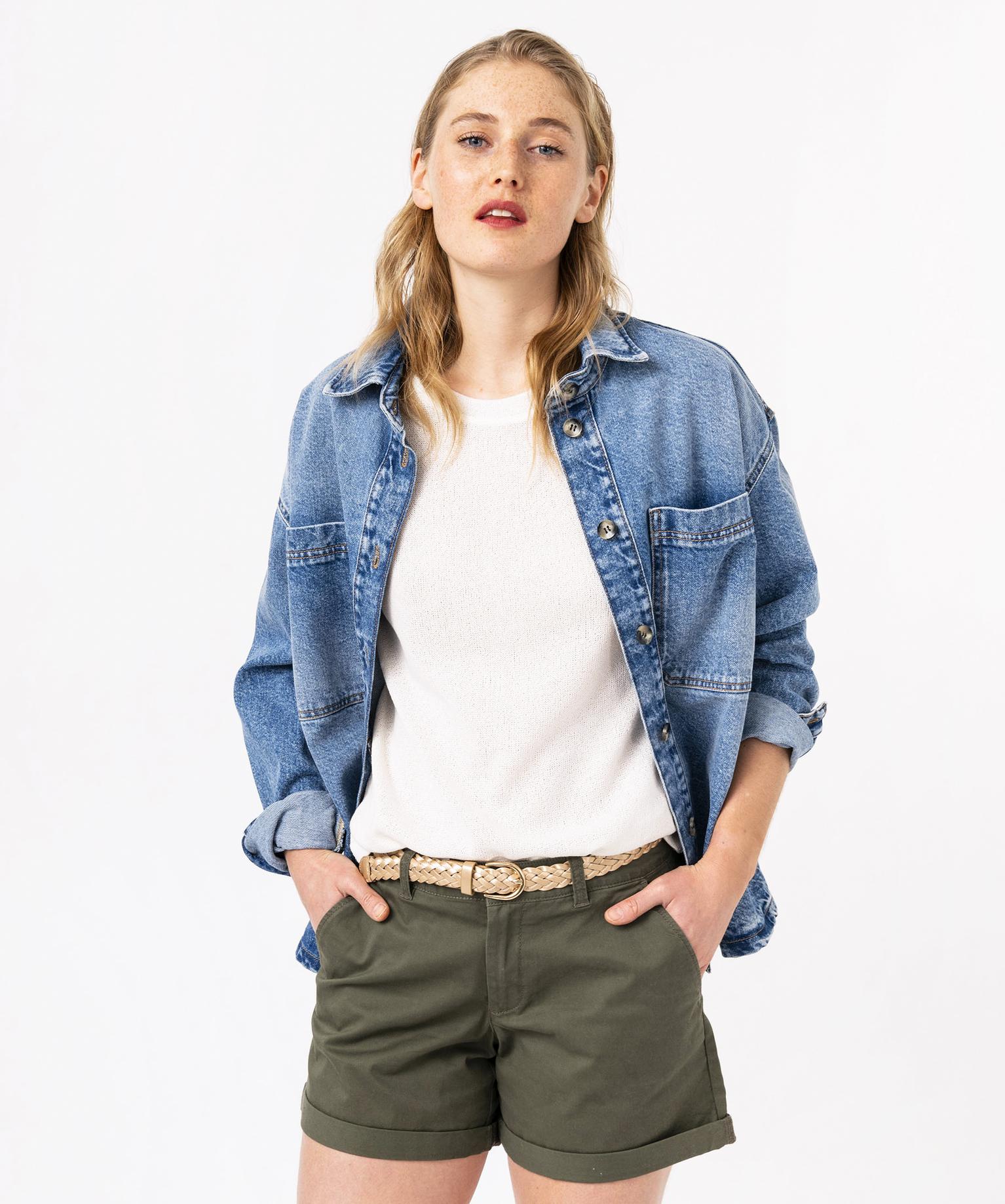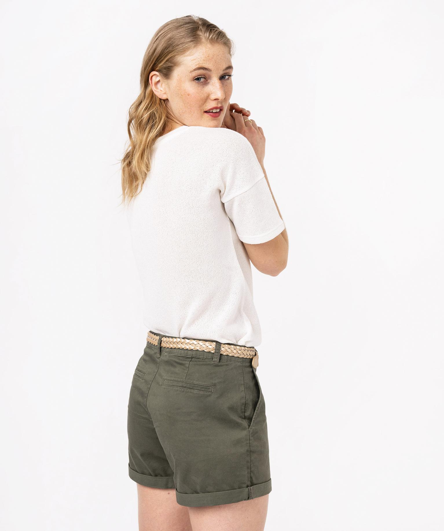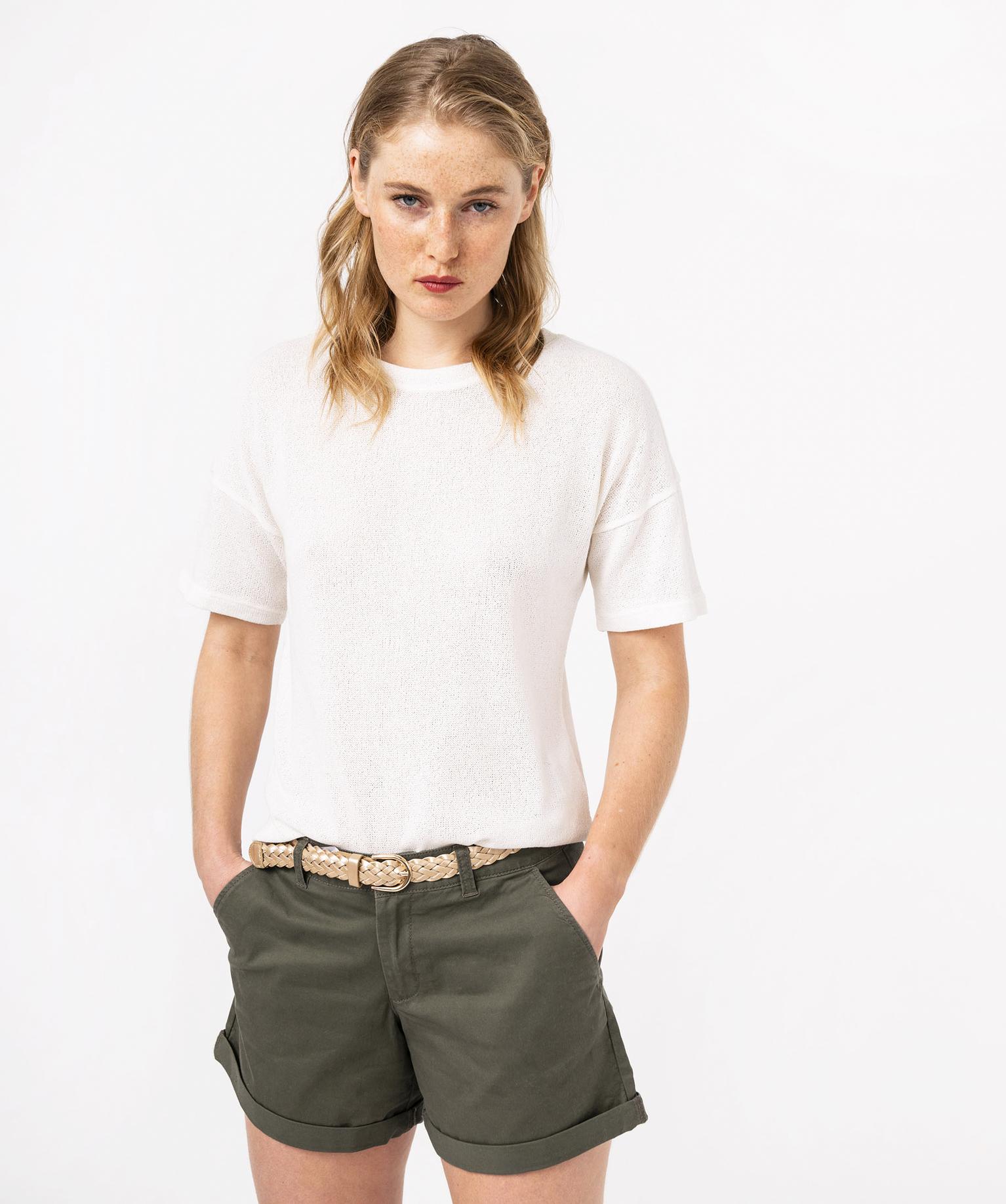 Vous allez adorer ce tee-shirt femme confectionné dans une maille de coton finement tricotée. Un basique revisité qui trouve sa place dans le dressing des femmes entre le pull à manches courtes et le tee-shirt traditionnel. Il affiche une coupe ample avec col rond bien dégagé et des épaules tombantes qui lui confèrent une allure loose. Un tee-shirt légèrement transparent à porter avec un jean comme avec un pantalon habillé.