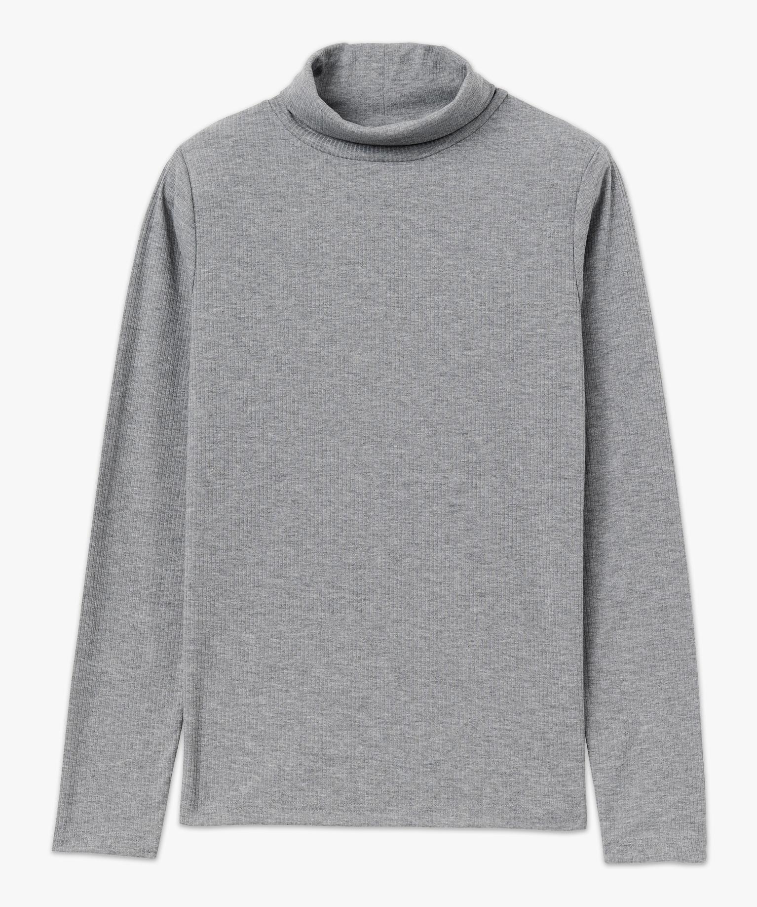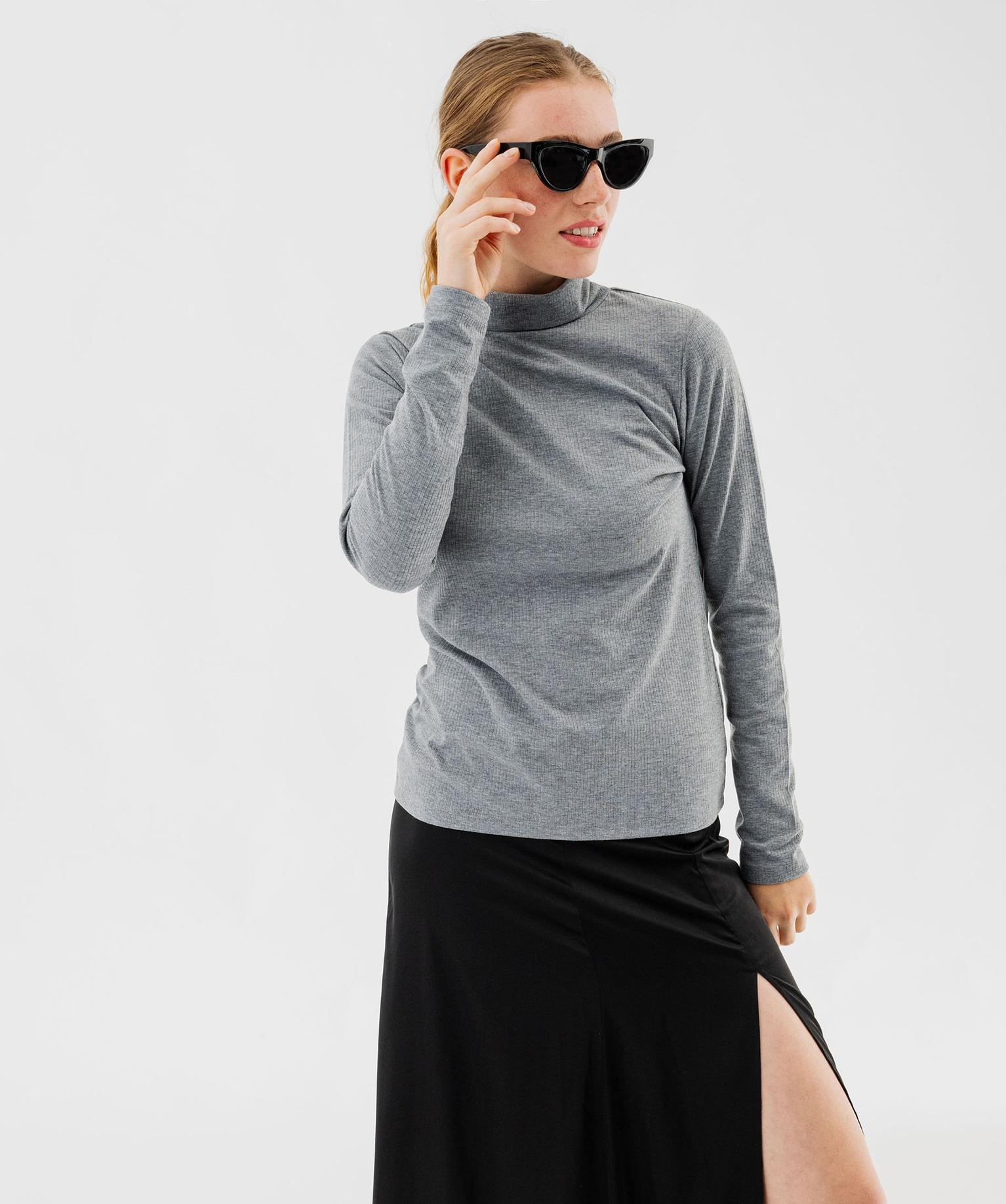 Basique incontournable de la saison automne-hiver, le tee-shirt à manches longues et col roulé. Une pièce sobre et facile à porter seule, sous un pull ou sous une veste de tailleur. Ce tee-shirt femme est confectionné dans une élégante maille côtelée composée majoritairement de polyester recyclé, ajoutant une note éco-responsable dans votre garde-robe.