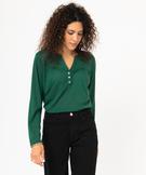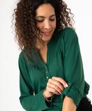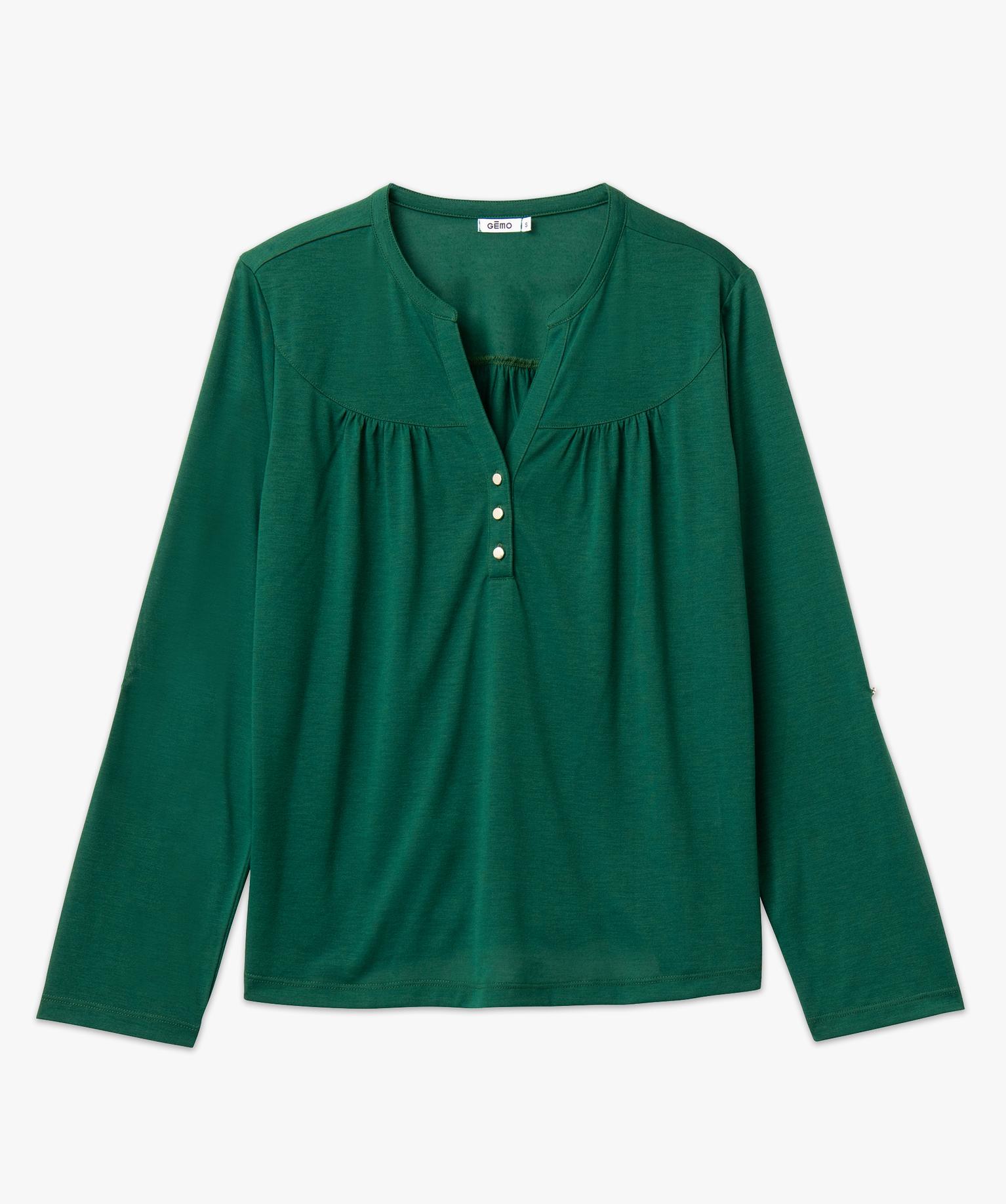 Vous allez adorer le style ultra féminin de ce tee-shirt à manches longues aux allures de blouse. Un tee-shirt uni doté d’un petit col en V prolongé par 3 petits boutons métalliques et de fronces sur le buste. Ce tee-shirt femme possède des manches qui peuvent se porter retroussées grâce à une patte qui se fixe à un bouton sur le dessus du bras. Ce tee-shirt se porte avec un pantalon uni pour un look chic en toute simplicité. Bas plus long au dos.