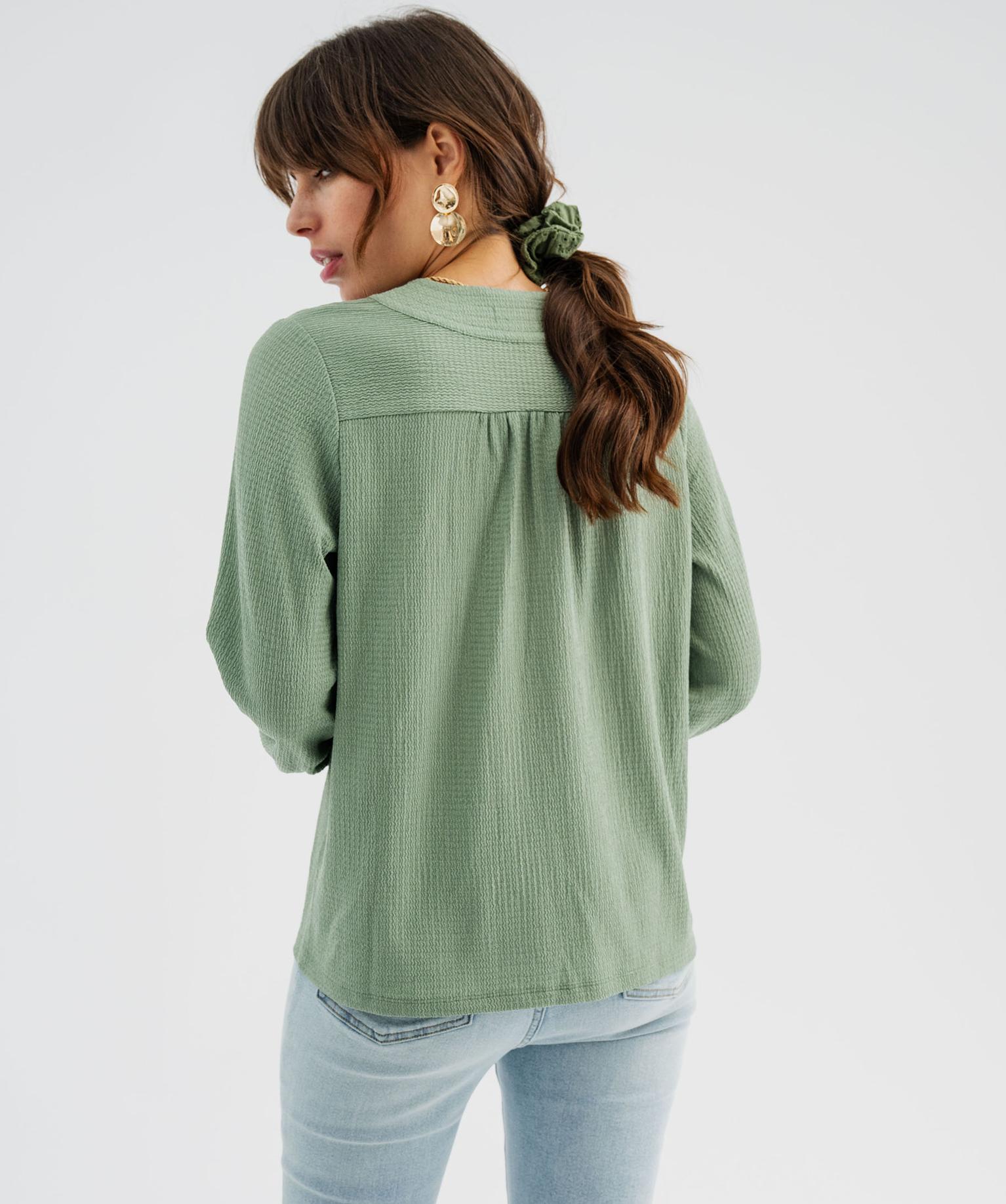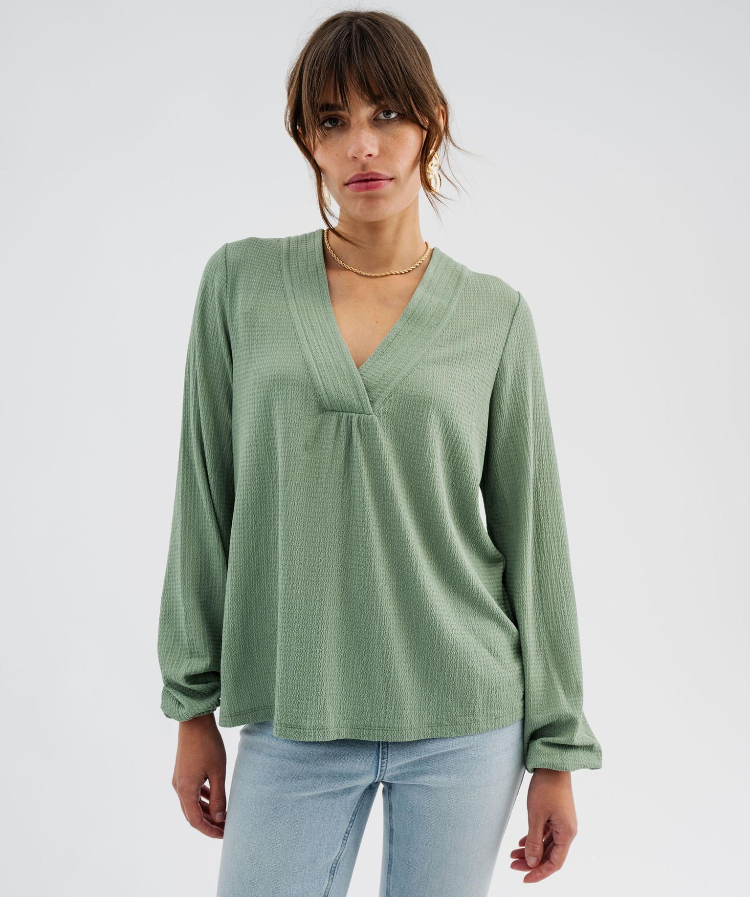 Tee-shirt à manches longues et col V en maille texturée femme vert