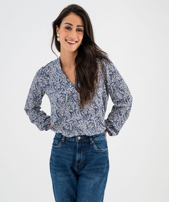 Élégant comme une blouse, ce tee-shirt à manches longues légèrement bouffantes vous surprendra par son confort. Il est fabriqué dans une matière texturée fluide et extensible, vous offrant liberté de mouvements et confort. Ce tee-shirt femme arbore un large col en V travaillé par des surpiqûres, des manches longues avec poignets resserrés par élastique et des fronces dans le haut du dos. Un haut imprimé facile à assortir à un jean comme à une jupe unie.