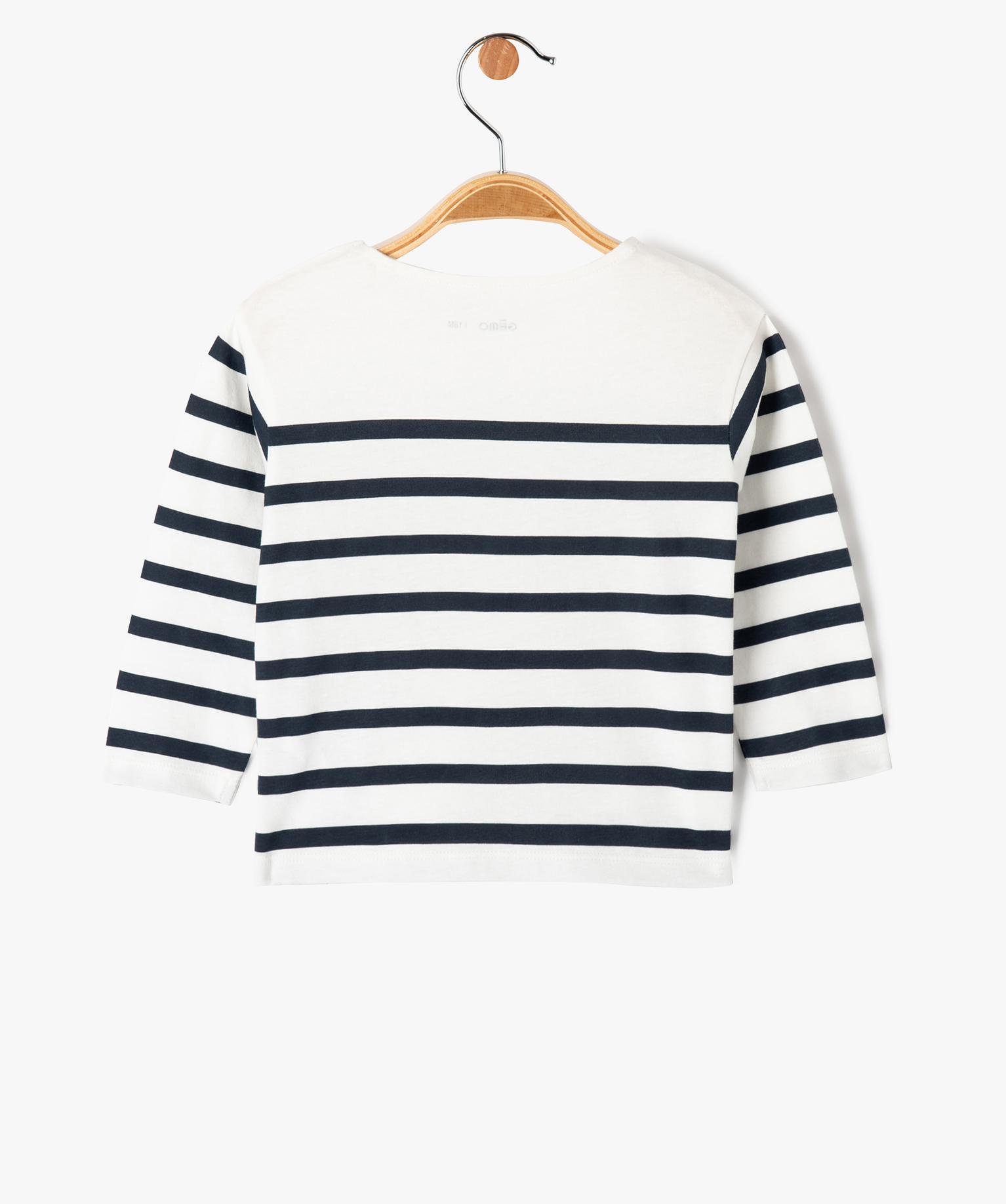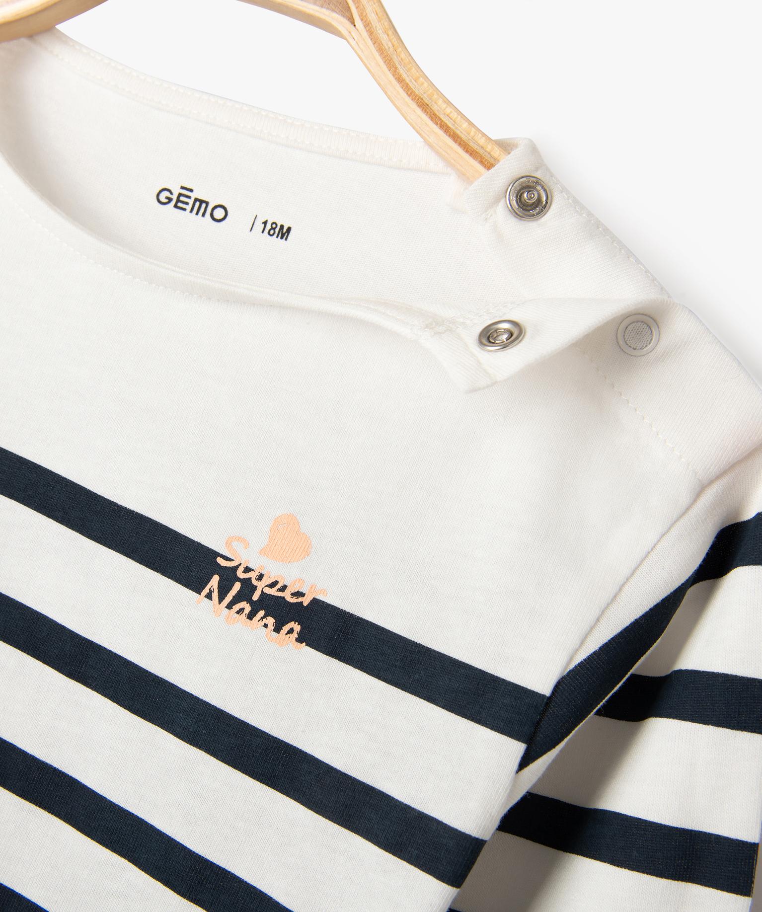 Quel que soit l’âge, il n’est pas pensable de passer un été sans marinière ! Cet adorable tee-shirt à manches longues orné de rayures et d’une charmante inscription sur le buste deviendra une pièce maitresse dans le vestiaire de votre petite fille. Confectionné en coton, il offre une douceur et un confort unique. Ce tee-shirt bébé fille possède un col rond qui s’élargit grâce à deux boutons pression sur l’épaule. Un must-have à porter avec un jean, un pantalon en toile ou une jupe, tout lui va !