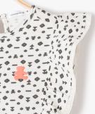 LuluCastagnette signe ici un superbe tee-shirt pour bébé fille. Original, il est élastiquée à la taille, créant un joli effet blouse. Le top à manches courtes est rehaussé de deux volants de part et d'autre du buste, devant et dos. Le col rond affiche une finition biais ton sur ton et s'ouvre à l'aide d'un bouton sur l'arrière, pour faciliter le passage de la tête. À l'avant, l'emblématique ourson Lulu décore discrètement la poitrine. Vous allez adorer la douceur et la souplesse de la matière coton flammé de ce tee-shirt. À porter avec un short en toile ou une jupe à volants !