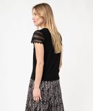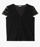 Tee-shirt boutonné à manches courtes en dentelle femme noir