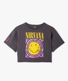 Plongez dans une ambiance 100% grunge avec ce tee-shirt Nirvana ! Arborant fièrement le Smiley emblématique du groupe de rock alternatif, ce tee-shirt fille à la coupe ample et courte vous transporte directement dans l'esprit des années 90. Ce tee-shirt à manches courtes sera le meilleur allié d’un jean ample et d’une paire de baskets pour un look décontracté emblématique de toute une époque. Col rond.