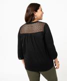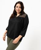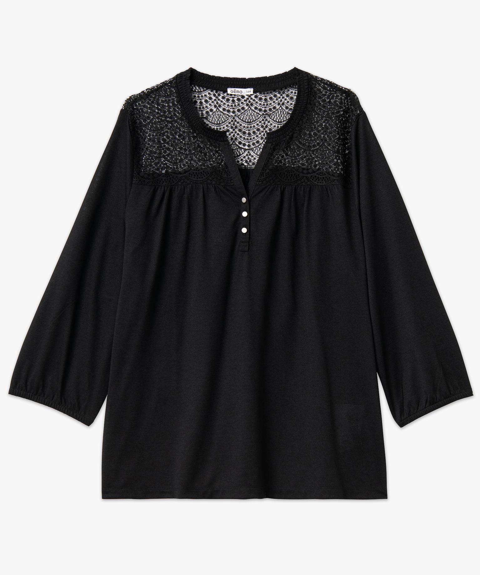 Pour une allure élégante et décontractée à la fois, adoptez ce ravissant tee-shirt à plastron en dentelle. Le tee-shirt pour femme grande taille (du 46/48 au 54/56) présente un col V en smocks autour du cou et terminé par de petits boutons argentés. Il est équipé de manches 3/4 terminées par un élastique pour un bel effet bouffant. Ce tee-shirt fluide et droit se mariera parfaitement avec vos bas les plus basiques comme les plus sophistiqués.