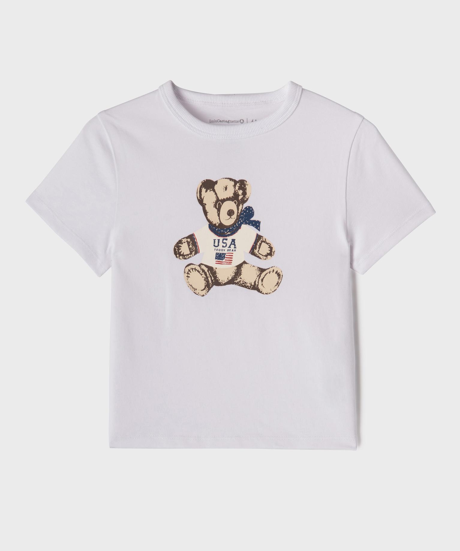 Les enfants vont adorer afficher un look collector avec ce tee-shirt issu de la collaboration Alizée x LuluCastagnette. Ce tee-shirt fille en coton extensible reprend les codes de la tendance Y2K. L'ourson emblématique s'affiche en grand format sur le devant pour un rendu visuel fort et nostalgique. Sa coupe intemporelle avec col rond et manches courtes en fait la base parfaite pour un look street avec un jean baggy ou sous une veste sans manches pour un style 100% années 2000.