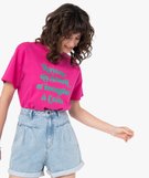 Le tee-shirt oversize est incontestablement le must-have de la saison. Confortable et stylé, il se porte avec un jean slim pour jouer les contrastes. Ce tee-shirt femme affiche une large inscription sur l’avant, un message estival qui nous fait directement passer en mode vacances ! Ce tee-shirt à manches courtes possède des emmanchures descendues qui renforcent l’esprit loose de sa coupe. Col rond en bord-côte.
