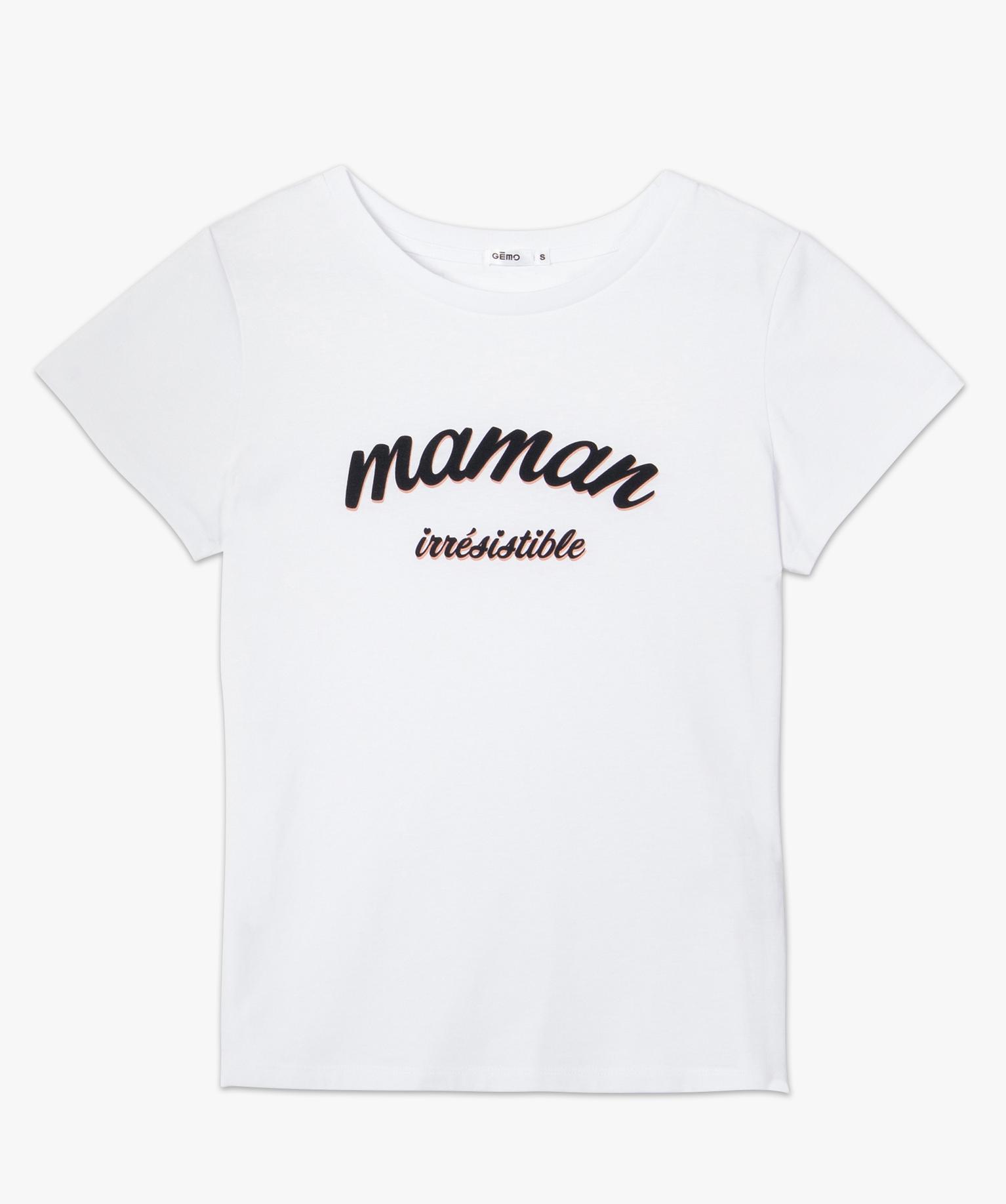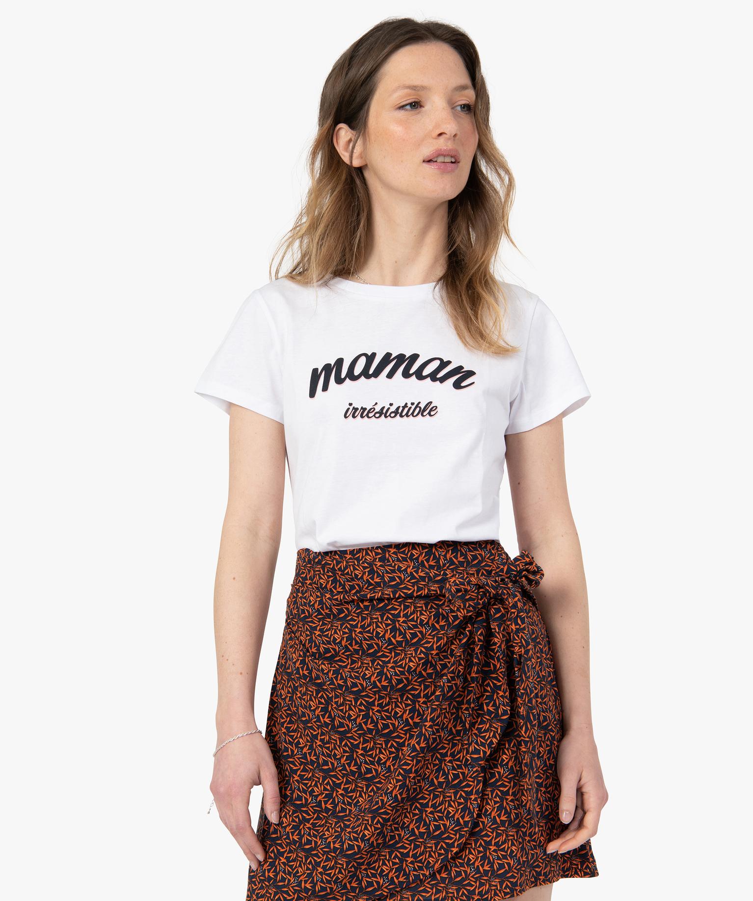 Un tee-shirt à manches courtes spécialement créé pour les mamans ! Avec son message « Maman irrésistible » sur le buste, ce tee-shirt femme est le cadeau de fête des mères idéal. On craque pour sa coupe intemporelle avec col rond en bord-côte et sa composition 100% coton si douce. Un tee-shirt à message à porter avec un jean et des baskets.