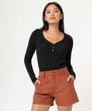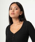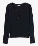 Ce tee-shirt en maille côtelée fait partie des pièces indispensables du vestiaire féminin. Confortable, facile à marier et très féminin, il sera le meilleur allié d’une jupe crayon ou d’un pantalon en toile. Ce tee-shirt femme possède un joli col en V bordé par un biais et se poursuit par une rangée de 3 petits boutons fantaisie. Un tee-shirt à manches longues à la coupe ajustée qui souligne la silhouette avec beaucoup d’élégance.