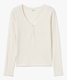 Ce tee-shirt en maille côtelée fait partie des pièces indispensables du vestiaire féminin. Confortable, facile à marier et très féminin, il sera le meilleur allié d’une jupe crayon ou d’un pantalon en toile. Ce tee-shirt femme possède un joli col en V bordé par un biais et se poursuit par une rangée de 3 petits boutons fantaisie. Un tee-shirt à manches longues à la coupe ajustée qui souligne la silhouette avec beaucoup d’élégance.