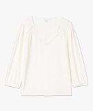 Ce tee-shirt à manches longues est la pièce indispensable de tous vos looks confortables mais élégants. On apprécie sa matière texturée et ajourée au niveau de l'encolure, tout comme ses fronces aux épaules et ses manches blousantes resserrées par un élastique aux poignets. Un tee-shirt femme à porter avec un jean flare.