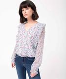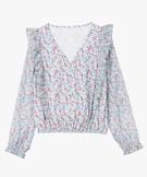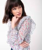 Vous allez tomber sous le charme de ce top à manches longues à mi-chemin entre le tee-shirt et la blouse. Confectionné dans une maille extensible, il possède des manches en voile transparent et des volants de chaque côté du buste. Un tee-shirt femme avec col en V qui se prolonge sur une rangée de boutons fantaisie. Resserré dans le bas et aux poignets, ce tee-shirt blouse offre une allure blousante particulièrement chic avec un pantalon slim.