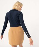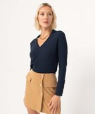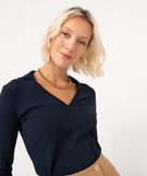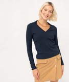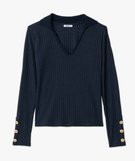 Vous allez tomber sous le charme de ce tee-shirt à manches longues confectionné en maille côtelée. Un tee-shirt femme inspiré du style marin, décoré de boutons métalliques aux poignets. Il met le décolleté en valeur grâce à un col polo avec large décolleté en V. Un top en maille élégant à porter avec un pantalon à ponts.