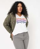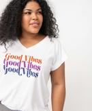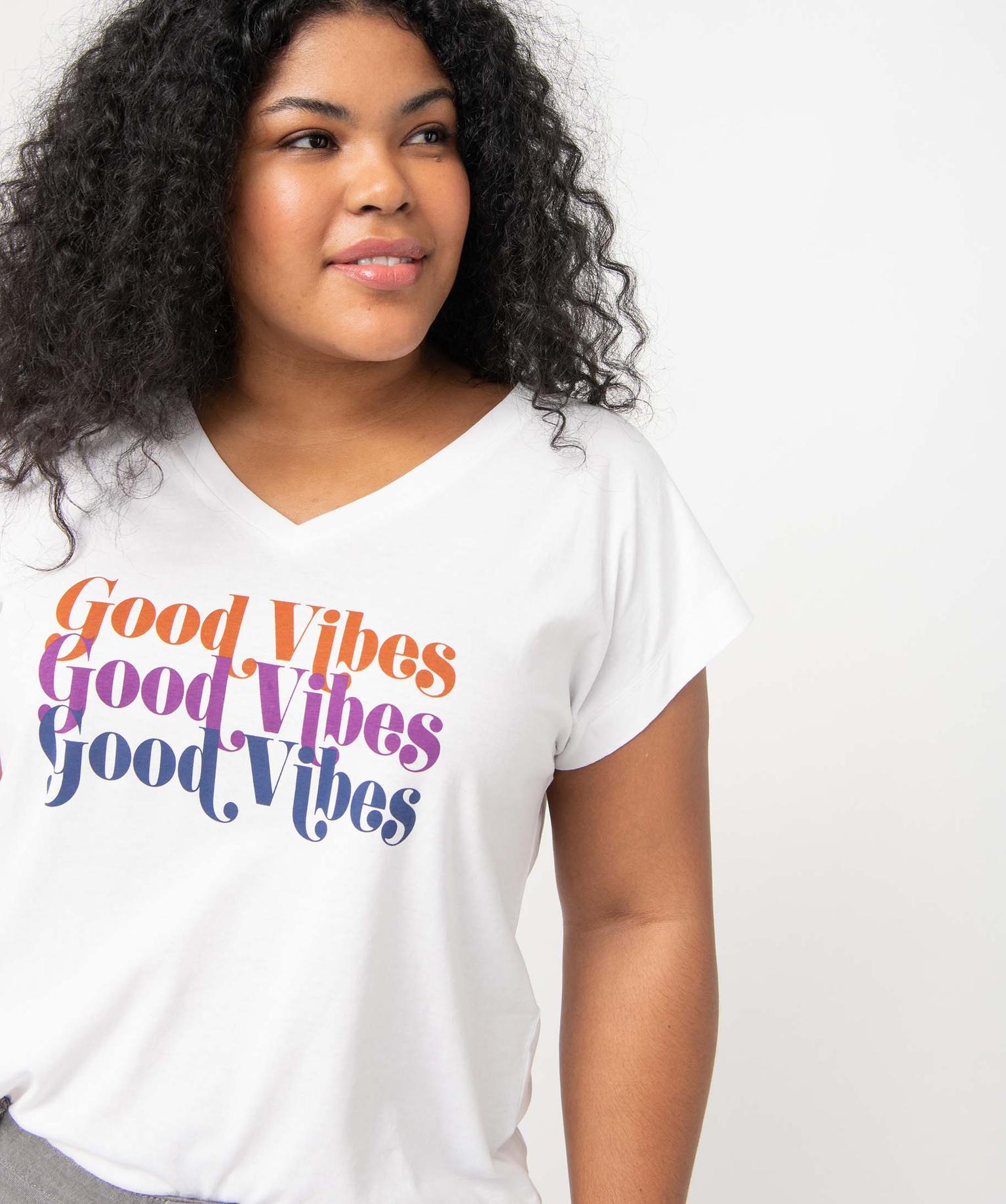 Bonnes vibes assurées dès l'habillage le matin avec ce tee-shirt à manches courtes imprimé ! Un tee-shirt pour femme grande taille (du 46/48 au 54/56) à la coupe loose très décontractée, col V à large biais féminin et cool, print poitrine en doré ou multicolore selon le modèle. À porter tout simplement avec un jean et des baskets montantes. Au top rentré dans une jupe tube accessoirisée d'une large ceinture. Dos uni. Pas de coutures aux emmanchures.