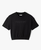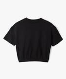 Une version atypique du tee-shirt à manches courtes qui plaira aux ados. Ce tee-shirt court est fortement inspiré du sweat et confectionné dans une matière plus épaisse que les tee-shirts classiques. Un tee-shirt fille avec col rond en bord-côte, bas resserré par un large élastique, épaules tombantes et message sur l’avant, à porter avec un jean taille haute.