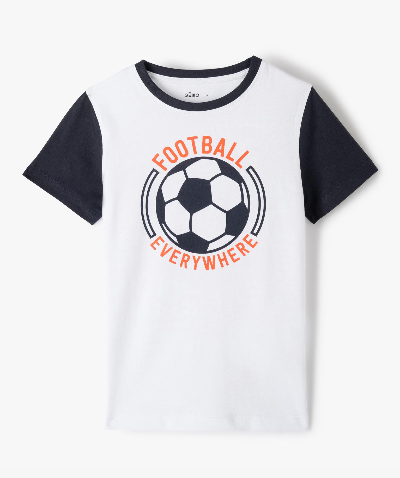 Ce tee-shirt est la pièce parfaite pour tous les jeunes passionnés de football ! Un véritable essentiel qui trouvera sa place dans le dressing de votre garçon. On apprécie sa coupe droite classique et ses manches courtes, idéales pour être à l'aise dans toutes les activités de la journée. Son col rond soigné et sa matière 100% coton le rendent très agréable à porter, que ce soit pour une journée d'école ou une partie de foot improvisée dans le jardin.