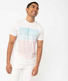 Pour mettre de la couleur dans vos tenues quotidiennes mais avec beaucoup de douceur optez pour ce tee-shirt homme. Le tee-shirt à manches courtes présente en effet sur l'avant un grand imprimé en dégradé pastel comme un tableau abstrait. Il rafraichira un jean brut, valorisera un pantalon en lin écru ou tempérera un bermuda à motif. Le tee-shirt est en coton, avec une coupe droite classique, facile à vivre. Col rond finition bord-côte. Dos uni.