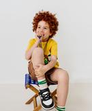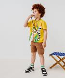 Pour un style décontracté et prêt pour l'exploration, on l'associe avec un short cargo et une paire de baskets à scratch. Un look simple et efficace pour l'école ou les sorties du week-end, qui mettra en valeur le grand motif placé sur le devant.