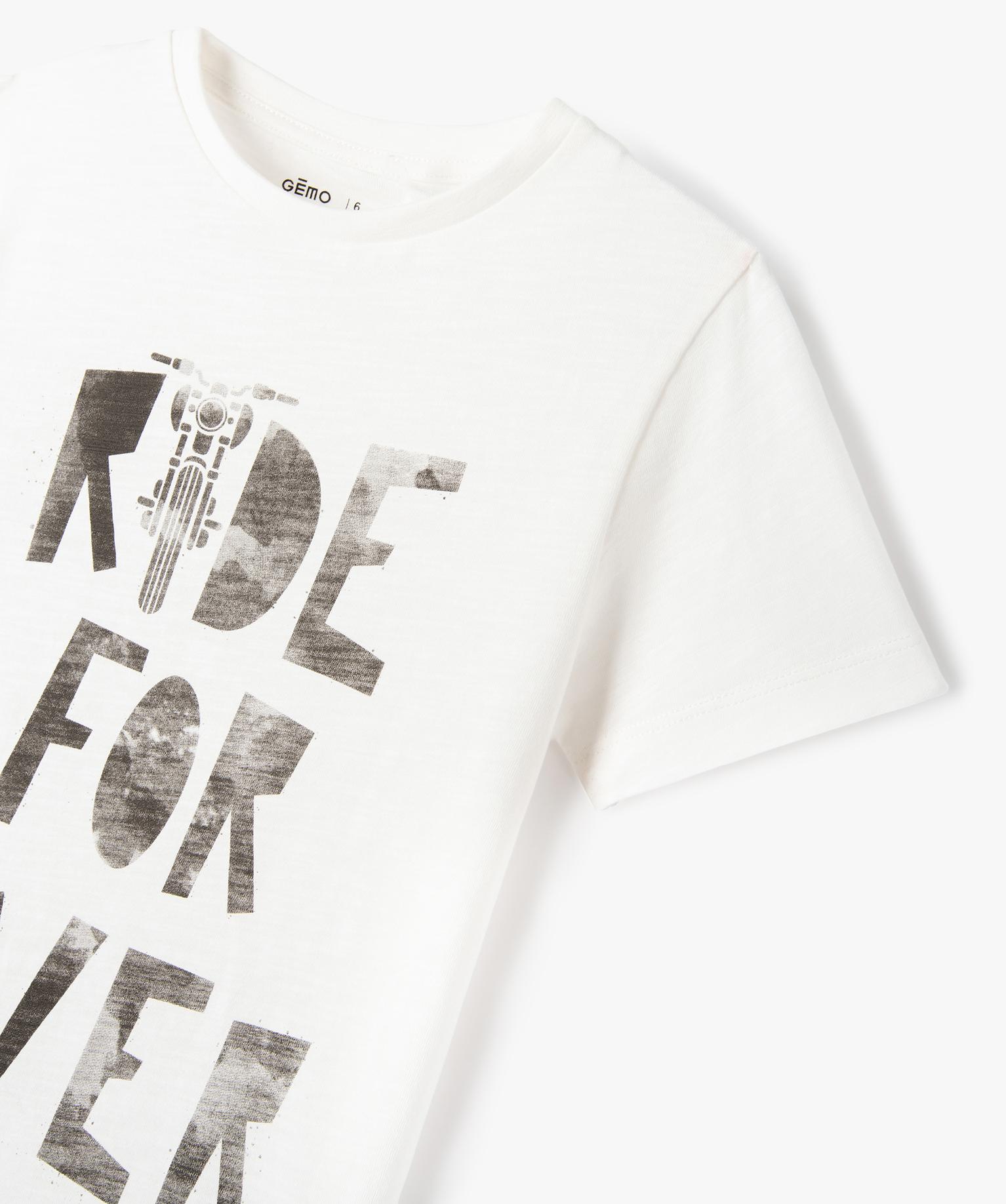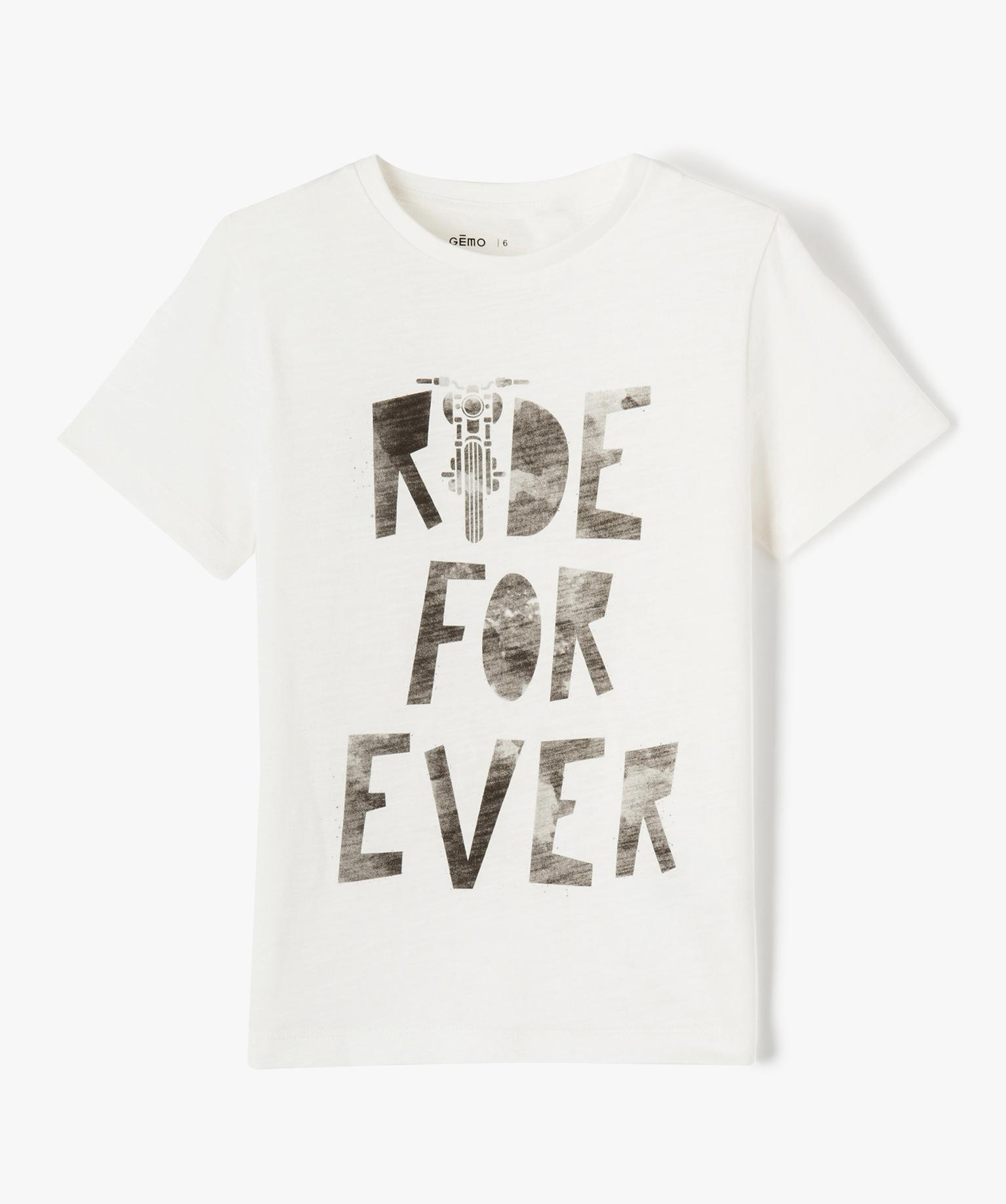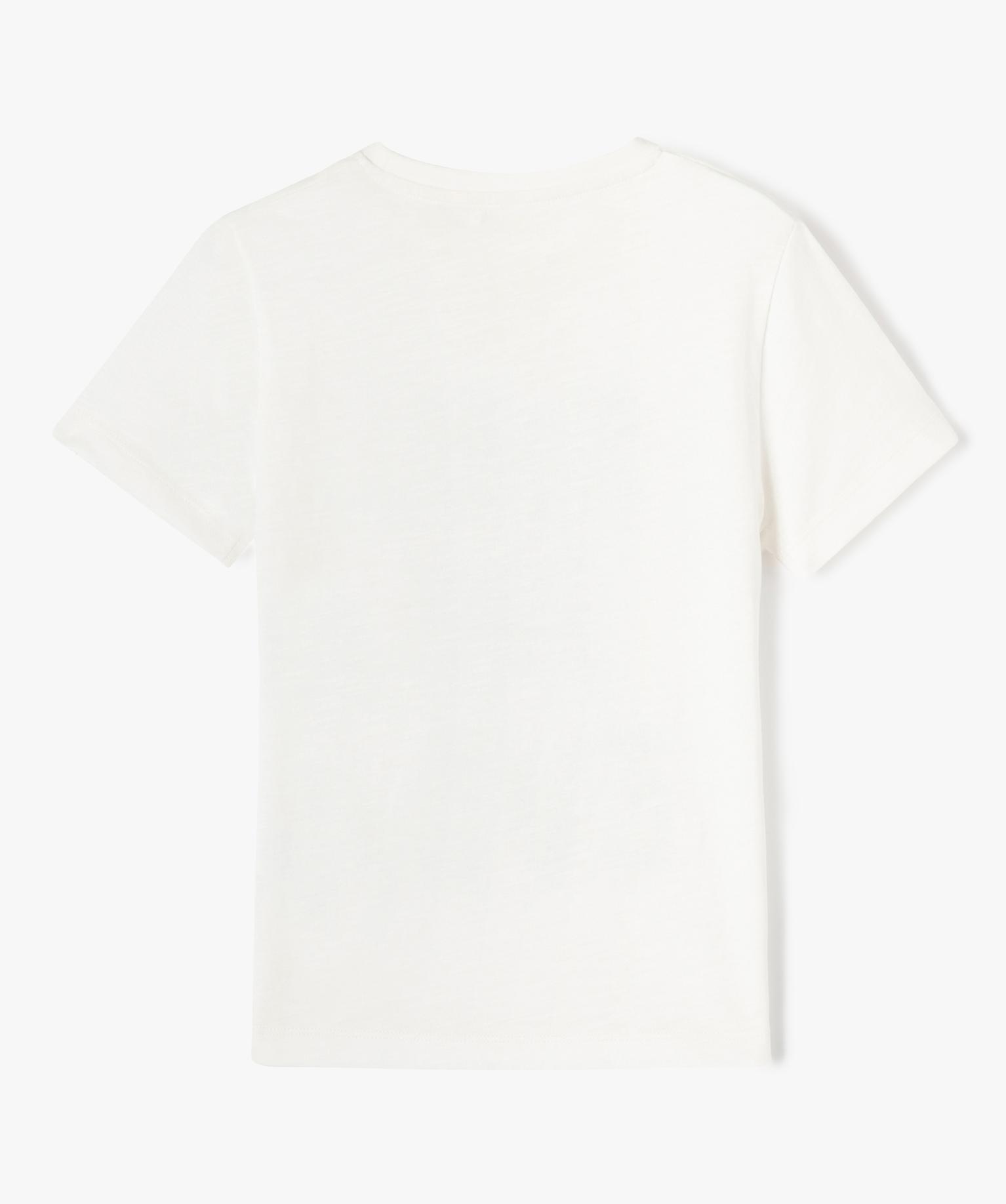 Ce t-shirt à manches courtes est un essentiel de la garde-robe des jeunes garçons. Confectionné en 100% coton, il offre une grande douceur et se révèle très agréable à porter au quotidien. Sa coupe droite et son col rond classique assurent une belle aisance de mouvement pour toutes les activités de la journée. Pratique, il s'enfile en un clin d'œil !