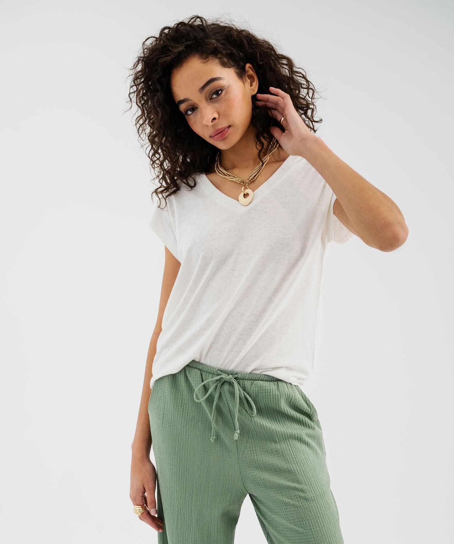 Tee-shirt manches courtes à col V coupe loose en lin femme blanc