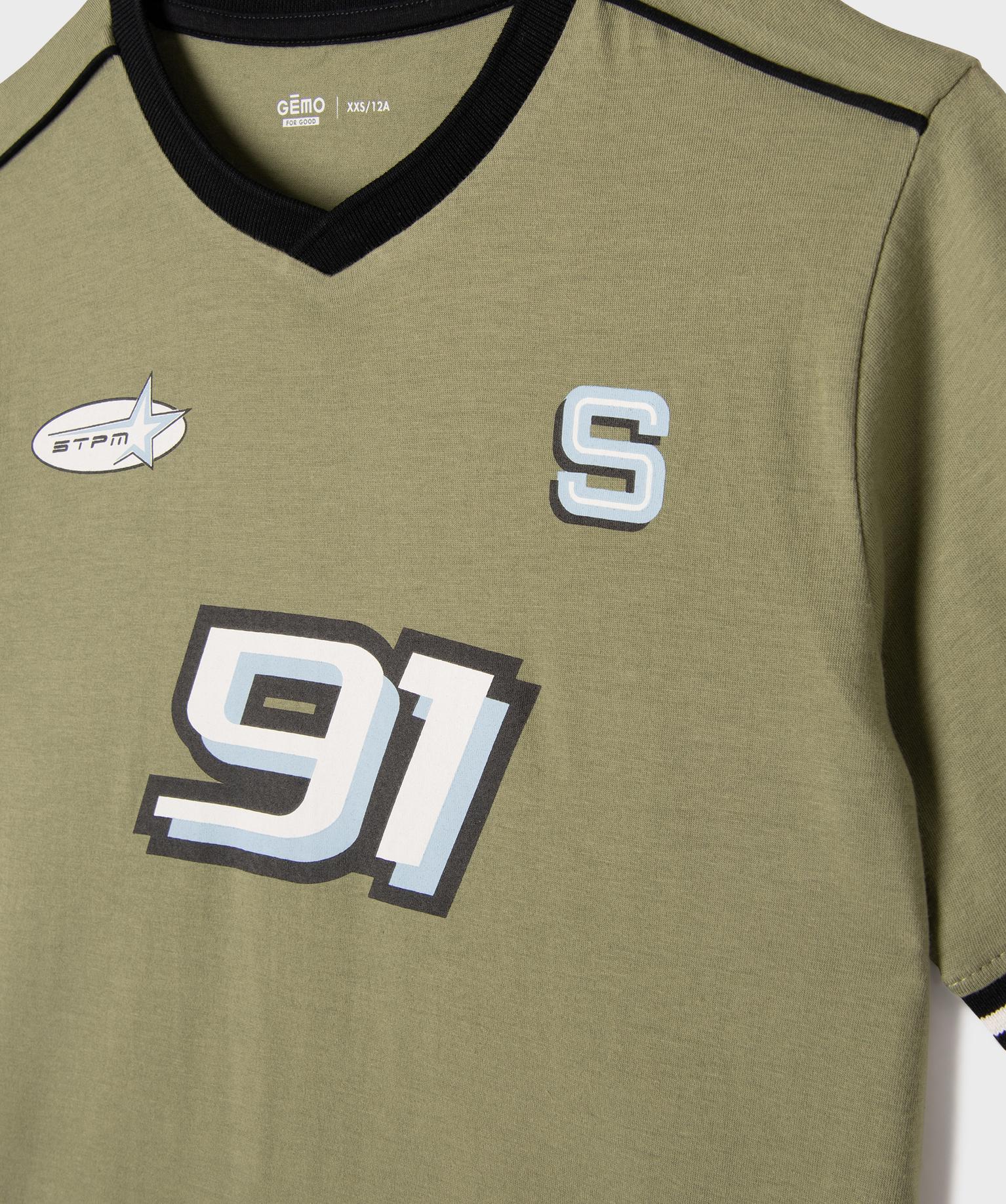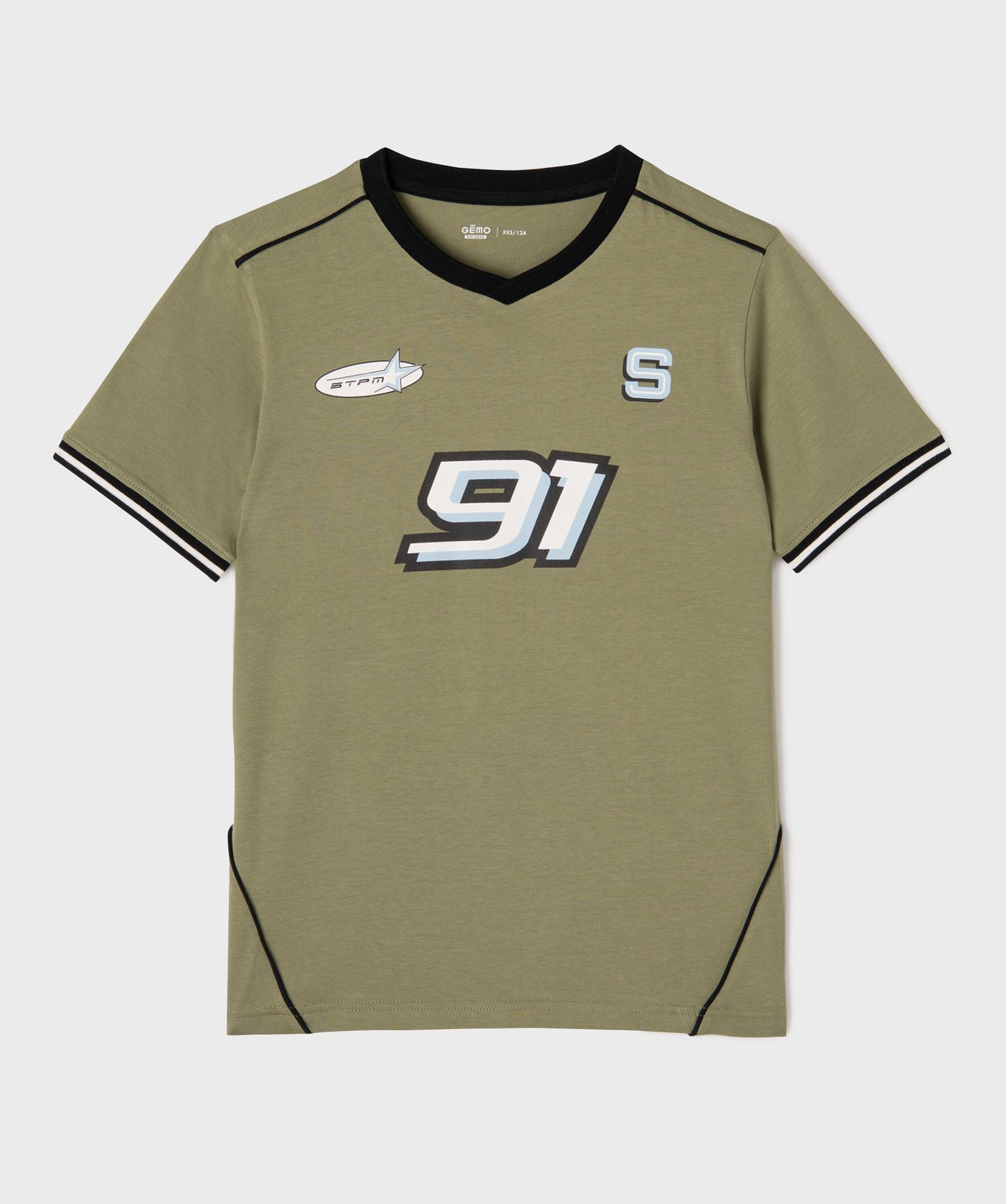 Gémo présente un tee-shirt plein d’énergie pour les garçons actifs ! Col V contrastant, bords-côtes bicolores aux manches, liserés décoratifs sur les épaules et dans le bas, ce tee-shirt garçon arbore un look sportif et stylé. Une inscription et des motifs sur le buste complètent ce modèle au style moderne et tendance. Un tee-shirt à manches courtes confectionné en coton et coton recyclé, idéal pour le quotidien ou les activités sportives. Dos uni.