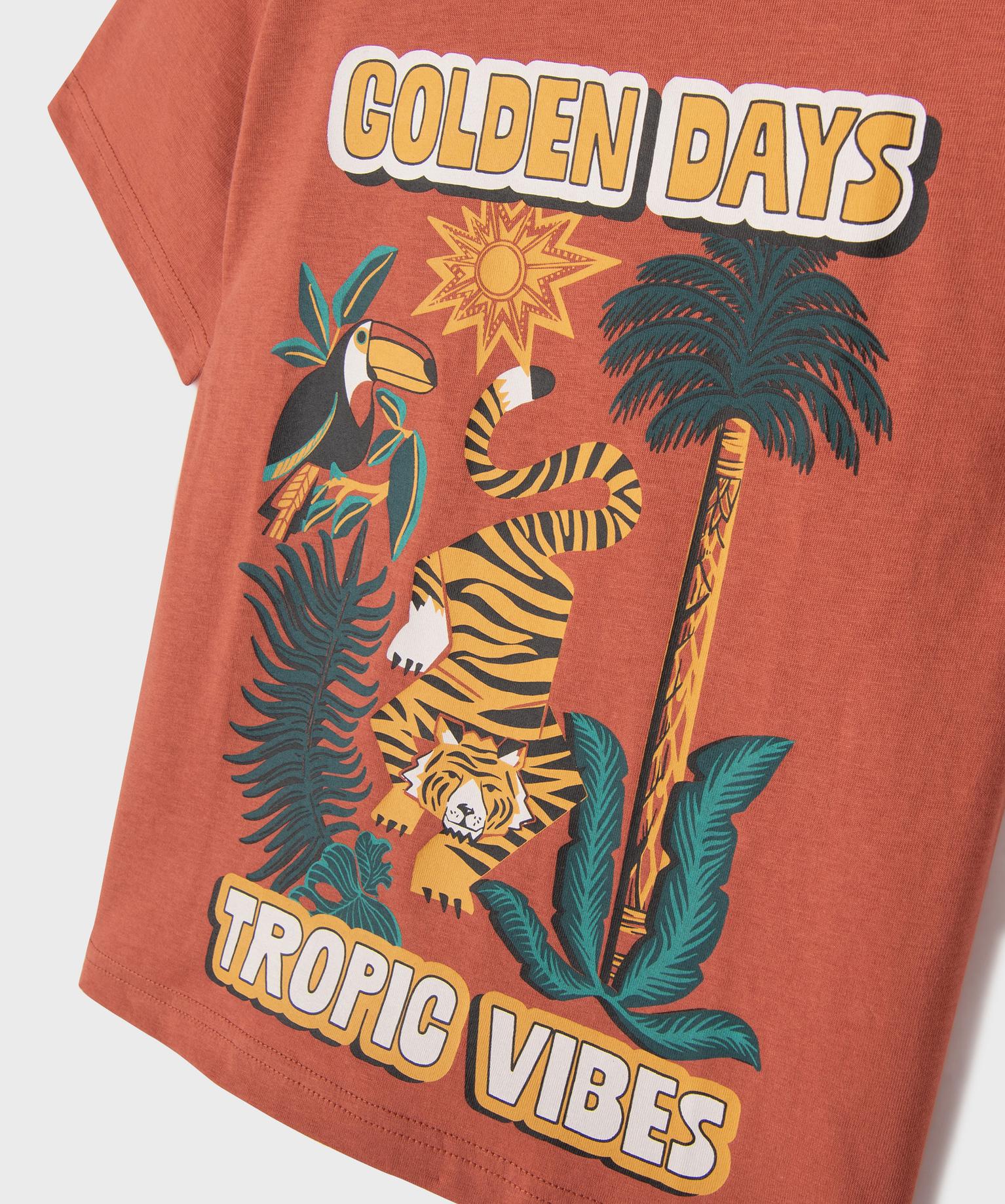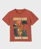 Donnez du pep’s au look de votre enfant avec ce tee-shirt imprimé à l’esprit estival. Son grand motif tropical aux couleurs éclatantes attire tous les regards. Doté de manches courtes et d'un col rond, c’est le basique facile à porter et à assortir. Ce tee-shirt garçon se porte en été avec un short et des sandales, mais aussi avec un jean et un gilet quand les températures baissent.