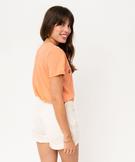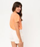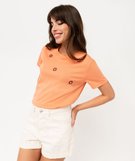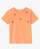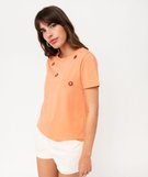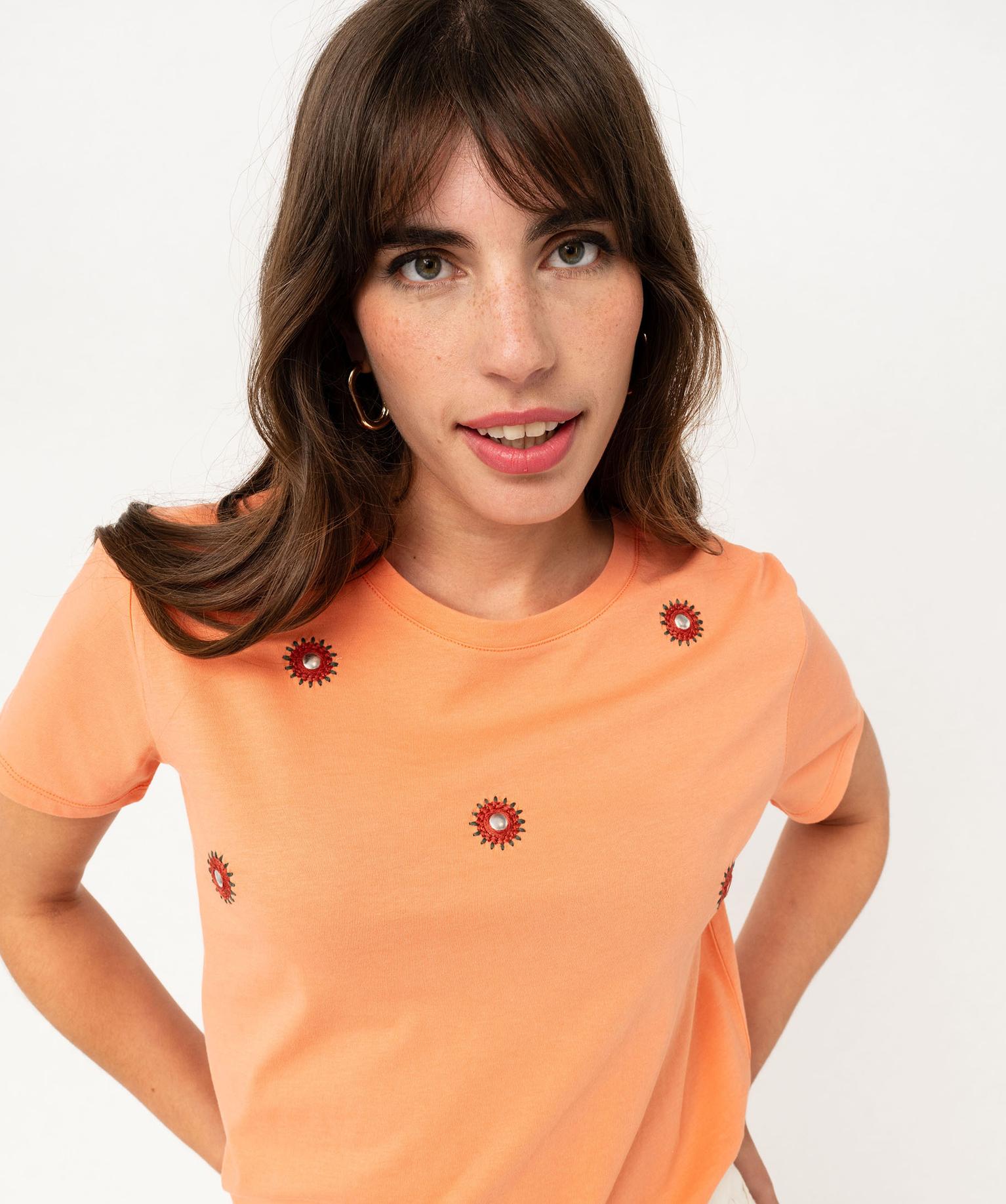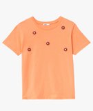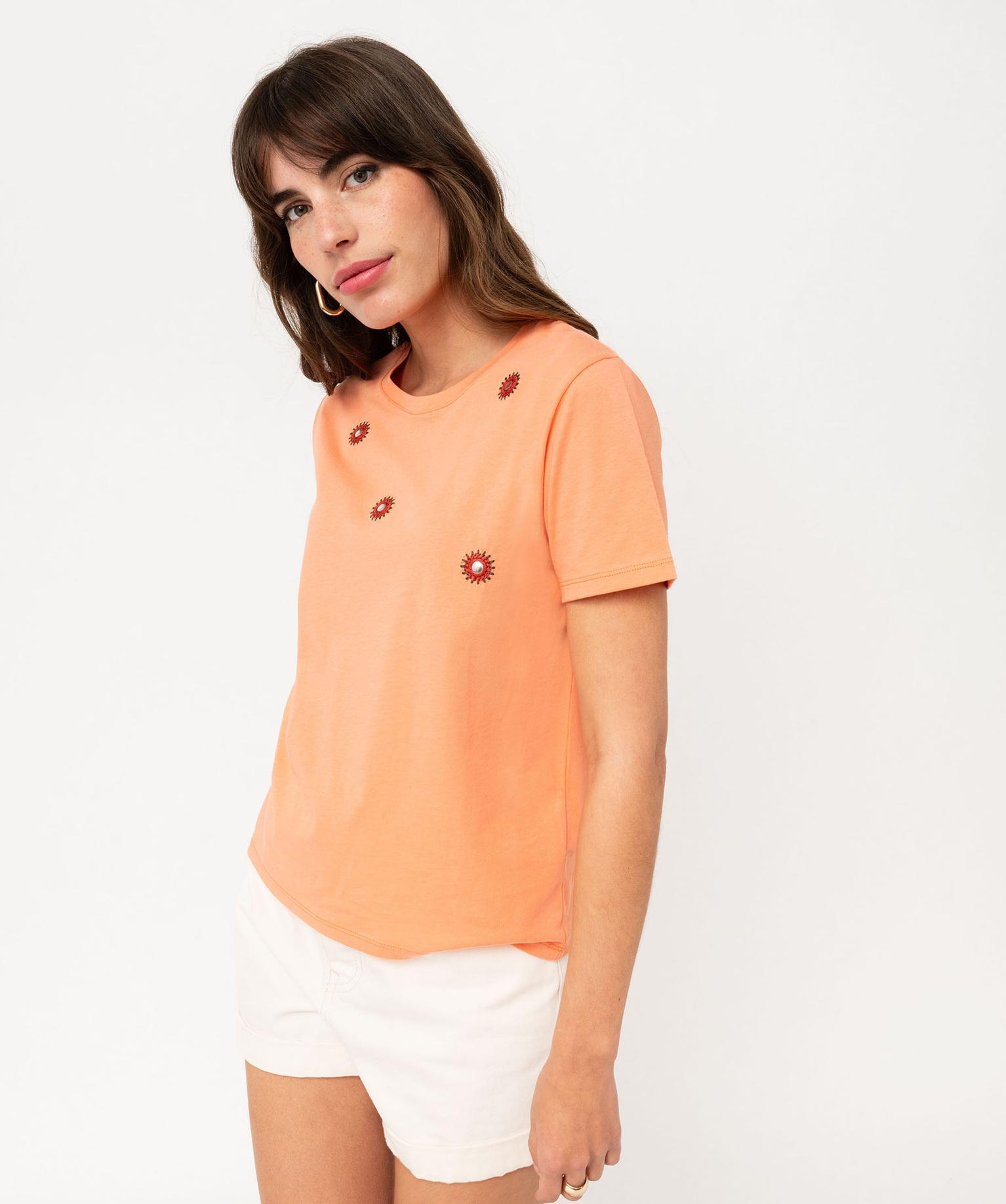 Tee-shirt femme en coton tout doux. Le tee-shirt manches courtes est décoré de motifs brodés en forme de fleurs. Le centre est en matière argentée, brillante, comme un effet de miroir. Le tee-shirt présente une coupe droite avec col rond en bord-côte, très classique, et donc facile à intégrer à l'ensemble de vos tenues. Dos uni.
