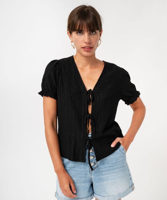Assurez-vous une allure féminine et romantique avec ce magnifique tee-shirt à manches courtes confectionné dans une maille ajourée façon broderie anglaise. Un tee-shirt femme dont les manches sont froncées sur les épaules et resserrées par un élastique, créant un effet bouffant. Ouvert sur l’avant, avec décolleté en V, il se ferme par trois liens à nouer et laisse apparaitre la pièce du dessous : top à bretelles ou débardeur près du corps. Un top élégant à associer à un pantalon en toile et une paire de derbies.