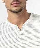 Une réinterprétation du tee-shirt col tunisien : le tee-shirt manches courtes présente ici un col en bord-côte uni terminé par un V et souligné d'une fausse boutonnière. Une encolure Idéale pour mettre en valeur votre cou et votre port de tête. Le tee-shirt homme se démarque également par ses fines rayures recousues dans le jersey pour un subtil effet de relief. Un tee-shirt à manches courtes 100% coton, idéal pour apporter un peu d'originalité à vos pantalons et bermudas.