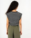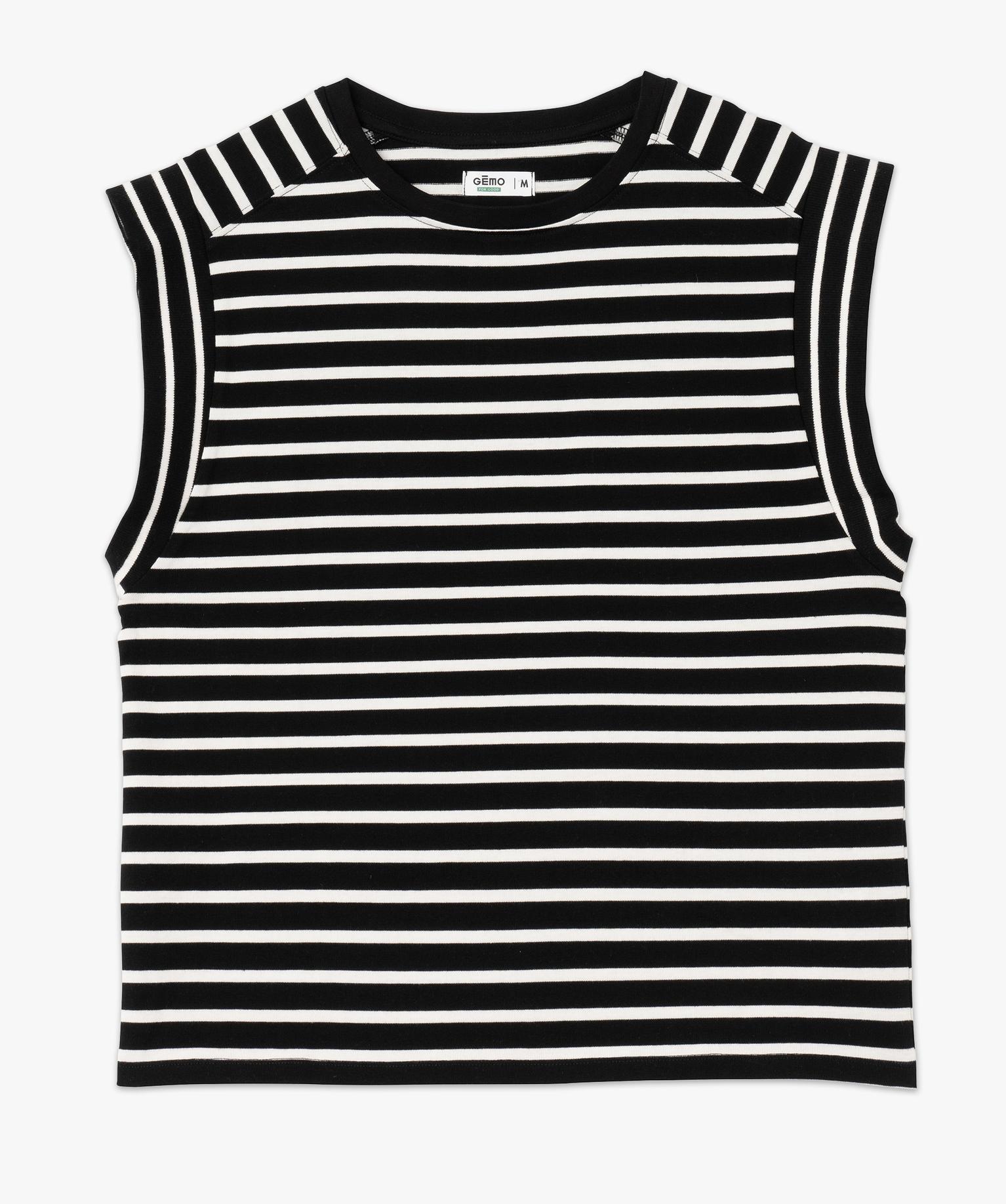 Gémo présente une version originale du traditionnel tee-shirt rayé. Il se distingue par ses larges finitions en bord-côte aux emmanchures ornées de rayures verticales qui forment des manches ultra courtes. Ce tee-shirt femme arbore un col rond et des doubles surpiqûres sur les épaules. Ample, confortable et totalement dans la tendance, ce tee-shirt à manches courtes se mariera à la perfection avec un jean slim.