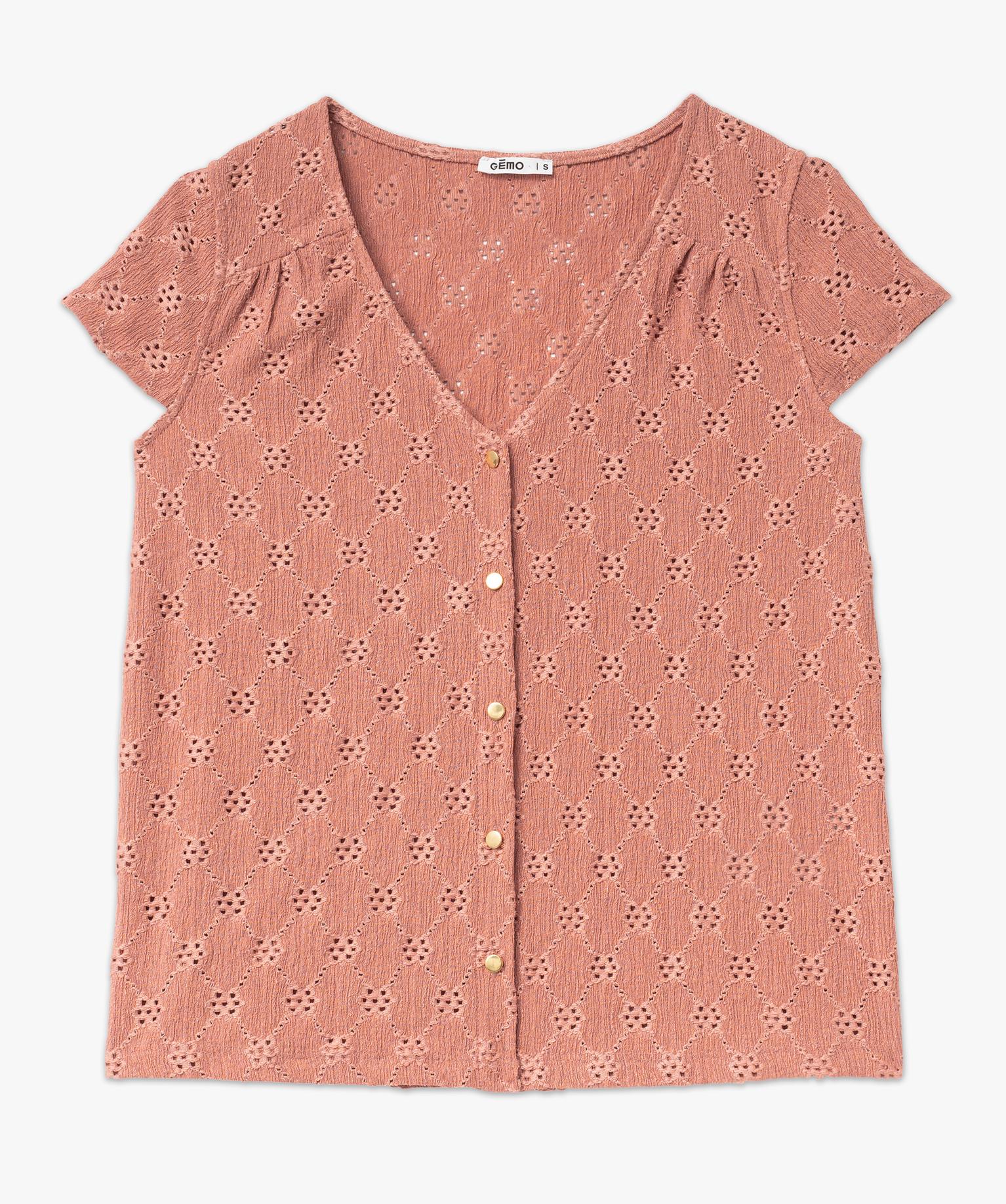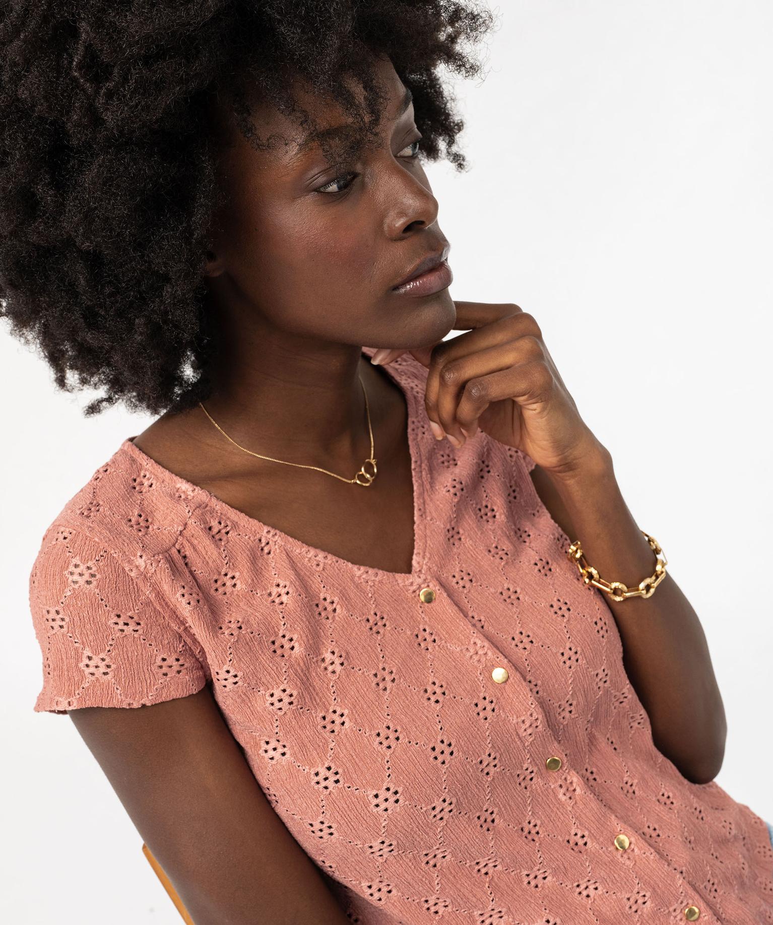 Tee-shirt manches courtes avec broderie ajourée femme rose
