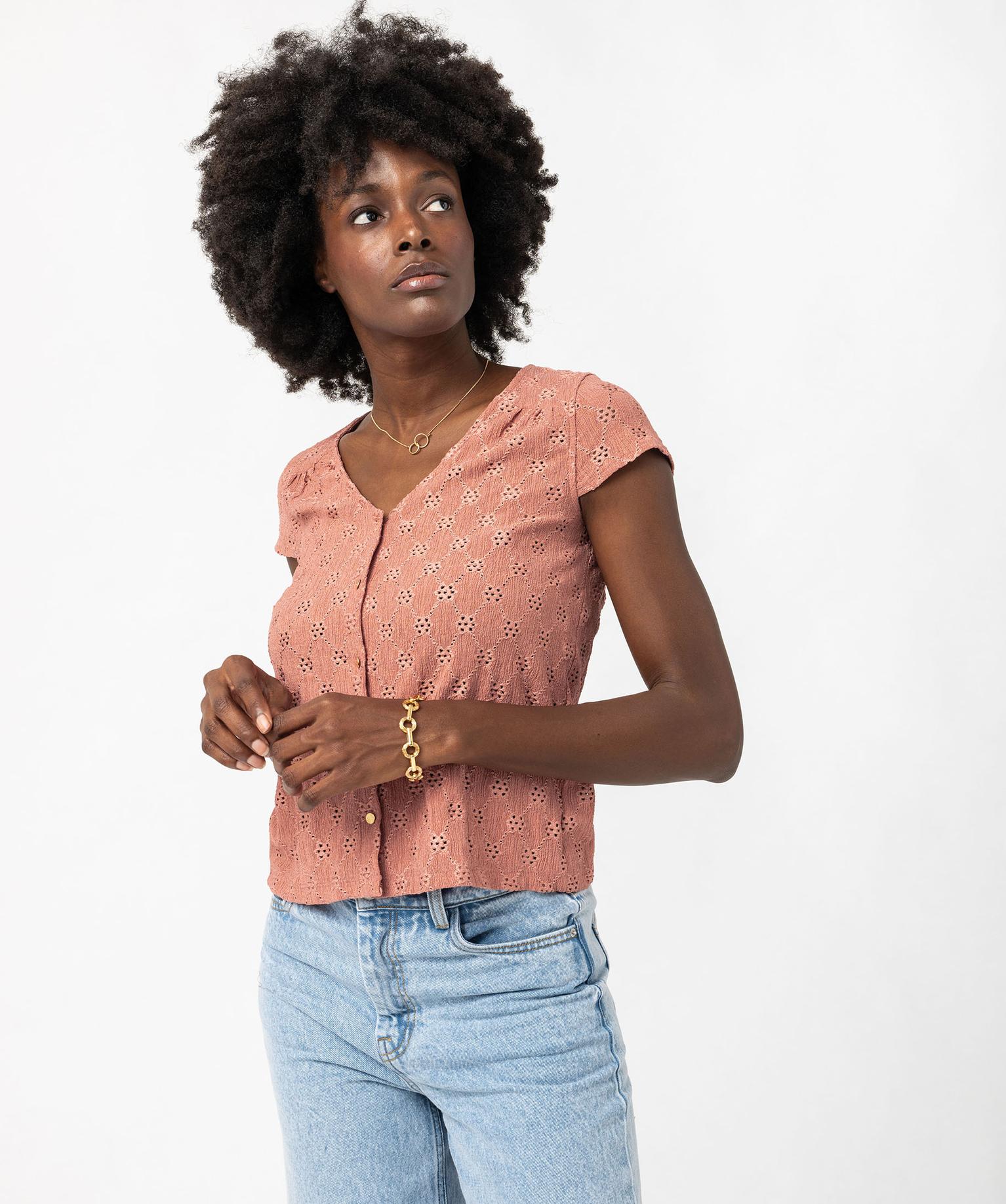 Elégant mix entre chemisier et tee-shirt, ce haut brodé pour femme vous assure une silhouette ultra féminine. Confectionné dans une maille extensible, il est aussi confortable qu’un tee-shirt. Agrémenté de détails raffinés : broderie anglaise, fronces sur l’avant des épaules, petits boutons métalliques, il passe aisément pour un chemisier. Ce tee-shirt à manches courtes chic se porte avec un pantalon en toile ou une jupe droite.