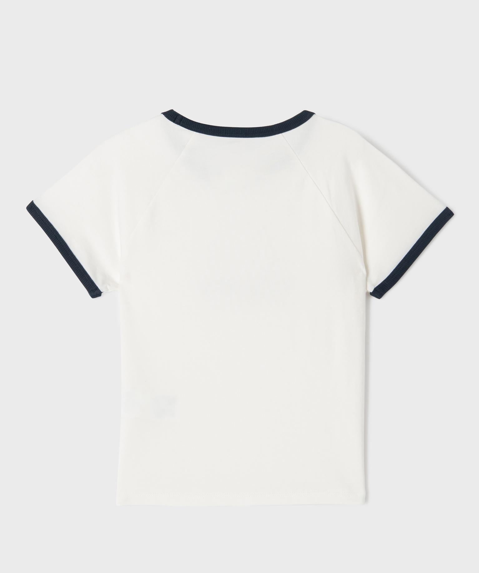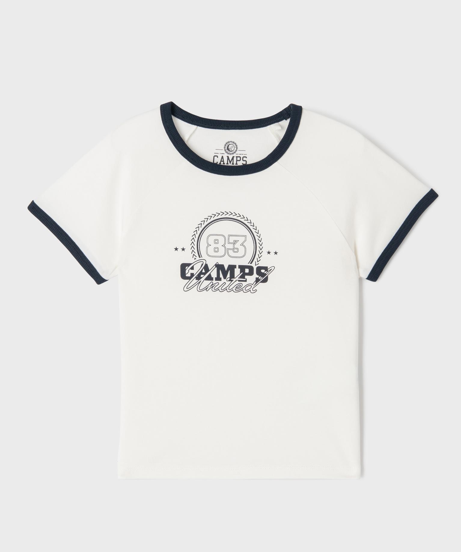 Ce tee-shirt fille s’inspire directement de l’univers campus emblématique de Camps United pour un look sporty et tendance ! Avec sa coupe courte ajustée, ses finitions contrastantes en bord-côte et son inscription sur le buste, il revisite le traditionnel tee-shirt à manches courtes avec style. Il sera le meilleur allié d’un jean large et d’une paire de baskets. Emmanchures raglan.