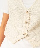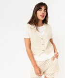 Tee-shirt femme à effet 2-en-1. Le tee-shirt manches courtes est agrémenté sur l'avant d'un faux gilet sans manches en maille ajourée. Pile dans la tendance des vêtements d'été en crochet. Le gilet présente une encolure en V, une découpe en pointes dans le bas et des boutons décoratifs en écaille imitation. Le tee-shirt est uni dans le dos. Col rond finition bord-côte.
