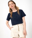 Ajoutez une délicate touche de transparence à vos tenues décontractées grâce à ce joli tee-shirt femme. Il est décoré d’une broderie ajourée sur le buste, différente selon les coloris. Un tee-shirt à manches courtes avec revers cousus et col rond en bord-côte à porter en version cool avec un jean et des baskets ou en version chic avec un pantalon ample et des sandales à talon.