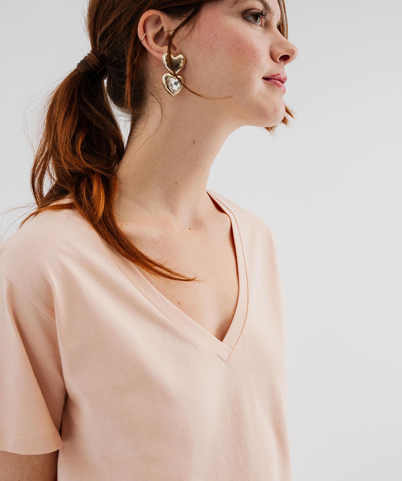 Tee-shirt manches courtes col V uni en coton femme rose