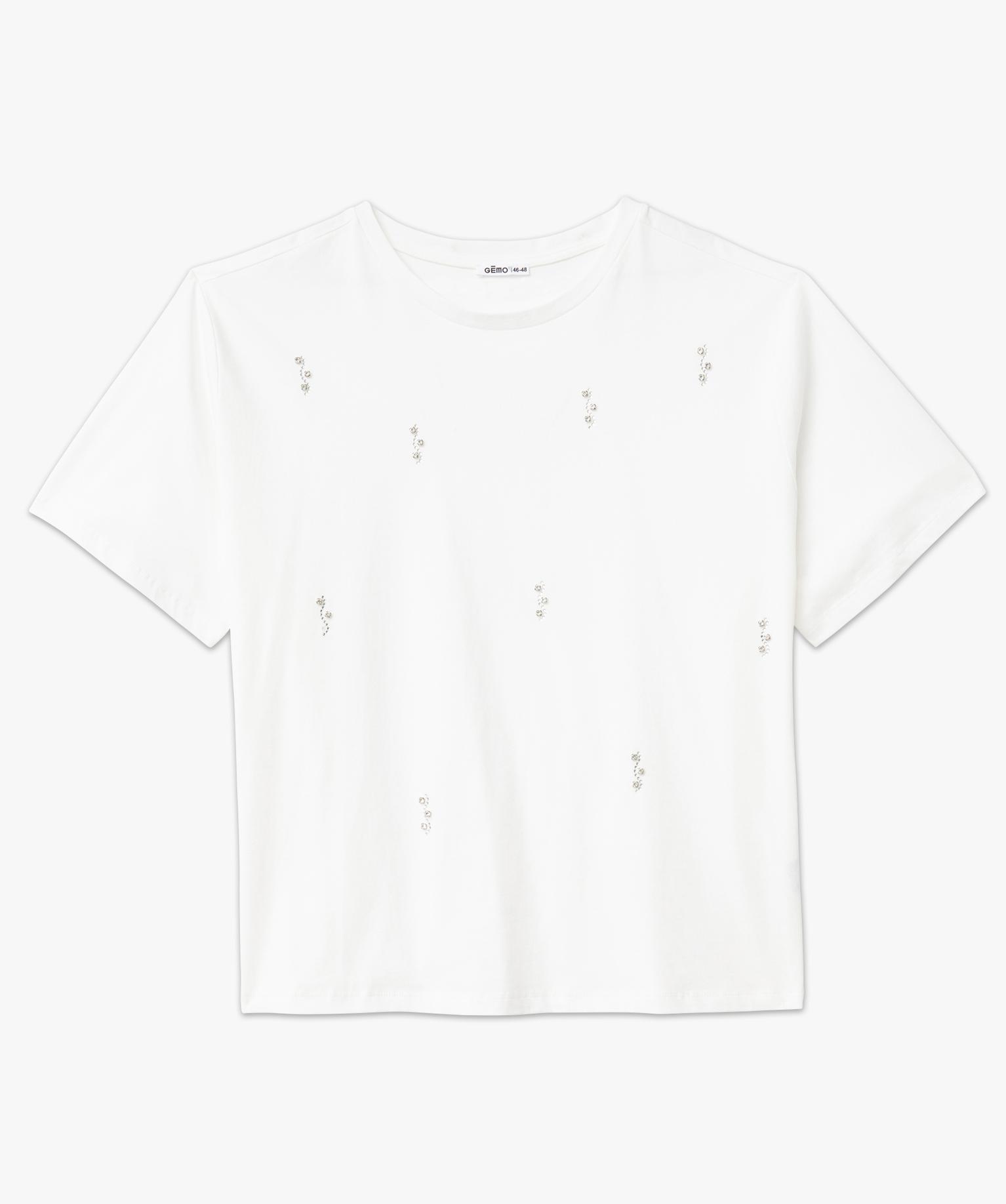 Tee-shirt manches courtes coupe large à strass femme grande taille blanc chine