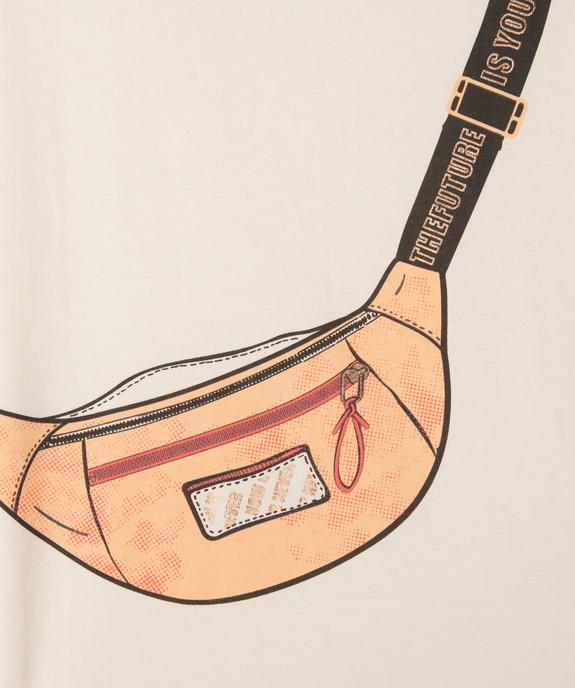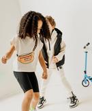 L'originalité s'invite dans le vestiaire des filles avec ce top unique en son genre ! Ce tee-shirt oversize à manches ultra-courtes, dotées de revers cousus, se distingue par un motif trompe-l'œil représentant un sac banane. Ce motif, illuminé par des détails pailleté, apporte une touche ludique et girly. Un tee-shirt fille à associer avec un jean slim et des baskets pour un look stylé et confortable.