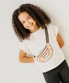 L'originalité s'invite dans le vestiaire des filles avec ce top unique en son genre ! Ce tee-shirt oversize à manches ultra-courtes, dotées de revers cousus, se distingue par un motif trompe-l'œil représentant un sac banane. Ce motif, illuminé par des détails pailleté, apporte une touche ludique et girly. Un tee-shirt fille à associer avec un jean slim et des baskets pour un look stylé et confortable.