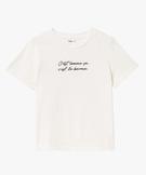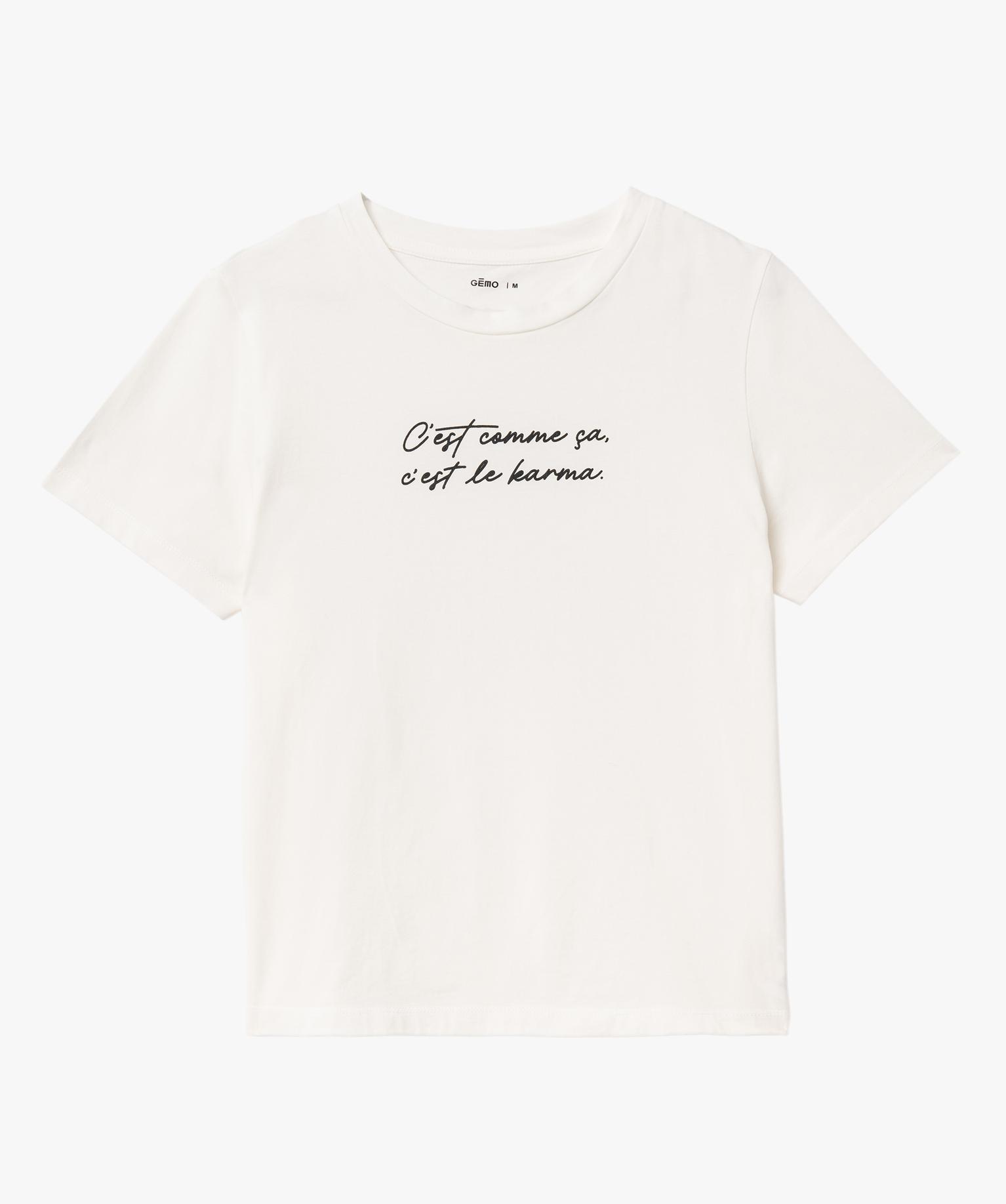 Embellissez votre vestiaire et vos tenues quotidiennes d'une pointe de fantaisie avec le tee-shirt manches courtes à message ! Orné d’une inscription sur l'avant et décliné dans divers coloris, ce tee-shirt femme s’intégrera facilement à vos looks casual. Vous apprécierez son design classique avec coupe droite et col rond en bord-côte, et sa confection coton ultra douce. Ce tee-shirt à message fait partie des indispensables et se porte seul, sous une chemise ouverte, une surchemise ou un blazer.