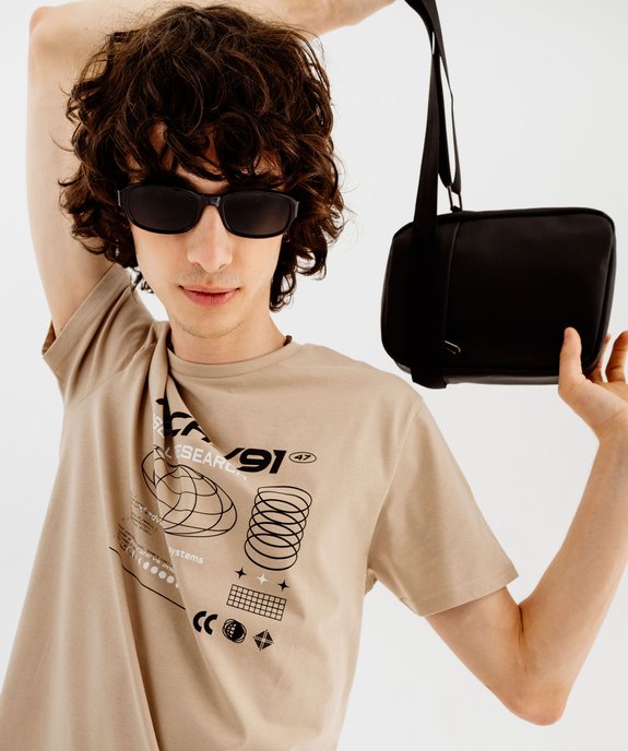 Tee-shirt manches courtes en coton imprimé homme beige taupe