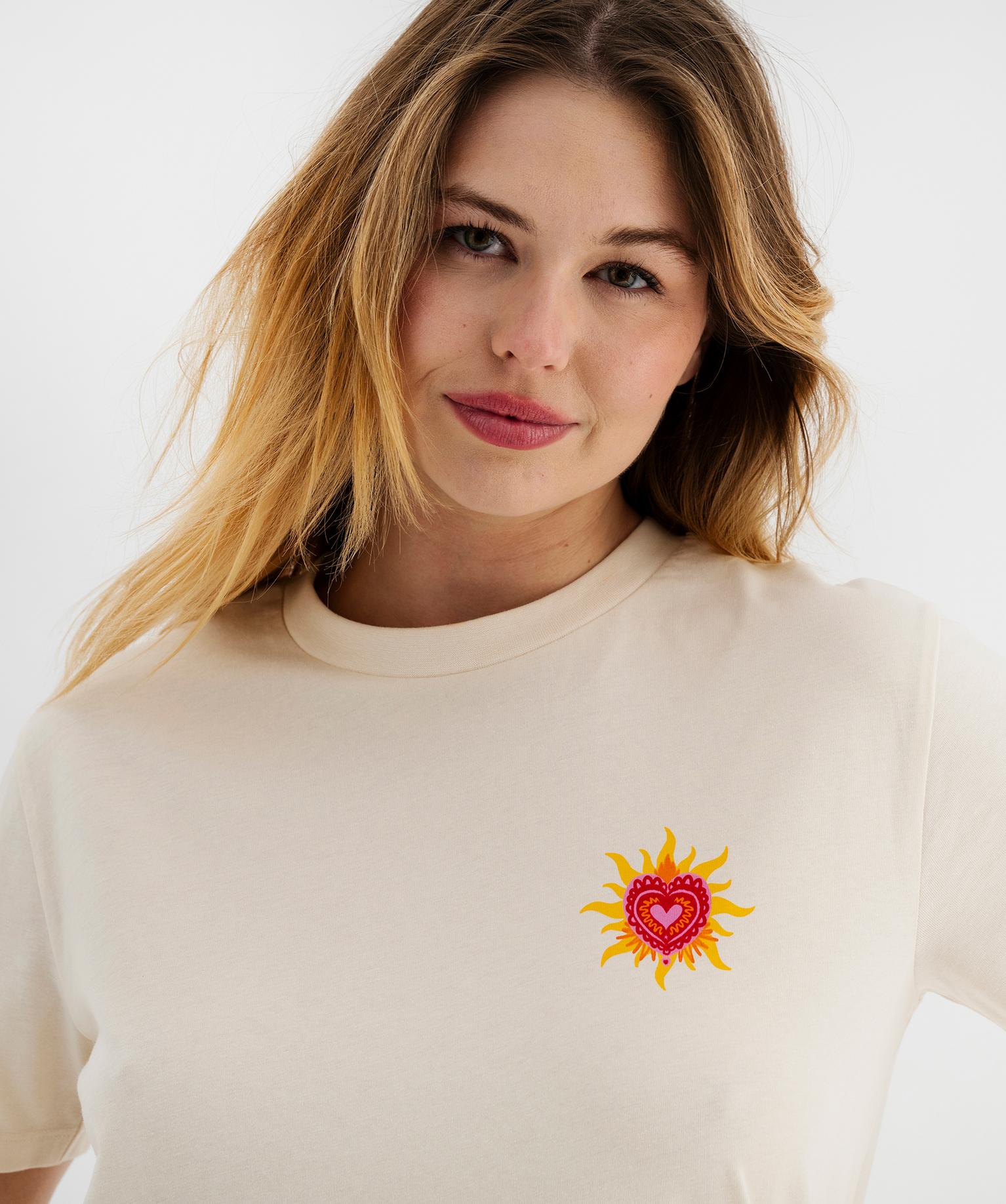 Ce tee-shirt femme en jersey de coton va vous plaire avec son imprimé coloré ! Le motif XXL dans le dos crée un effet spectaculaire. On le retrouve en écho sous la forme d'un petit motif poitrine. Inspiré des ex-voto, le motif est chatoyant ! Sa coupe large et son col rond avec finition bord-côte assurent confort et style au quotidien. Le tee-shirt manches courtes parfait pour celles qui aiment les imprimés audacieux et les tenues estivales pleines de couleurs.
