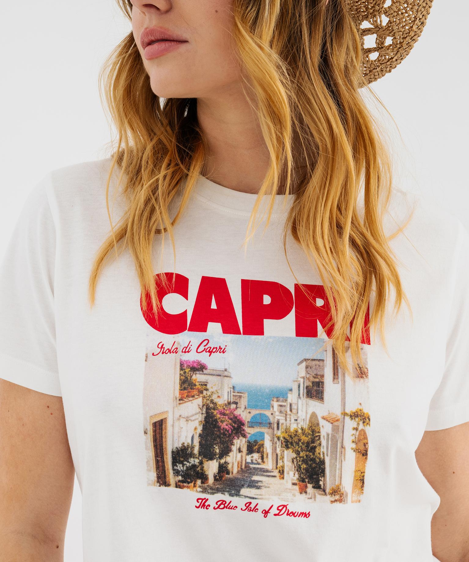 Ce tee-shirt femme à manches courtes classique en jersey de coton offre un confort optimal pour le quotidien. Sa coupe simple et efficace est sublimée par un col rond en large bord-côte, et un grand imprimé photo représentant la ville italienne de Capri. Top pour une apporter une touche estivale et graphique à vos shorts en jean et pantalons en toile. Léger et facile à porter, ce tee-shirt est à glisser absolument dans votre valise des vacances.