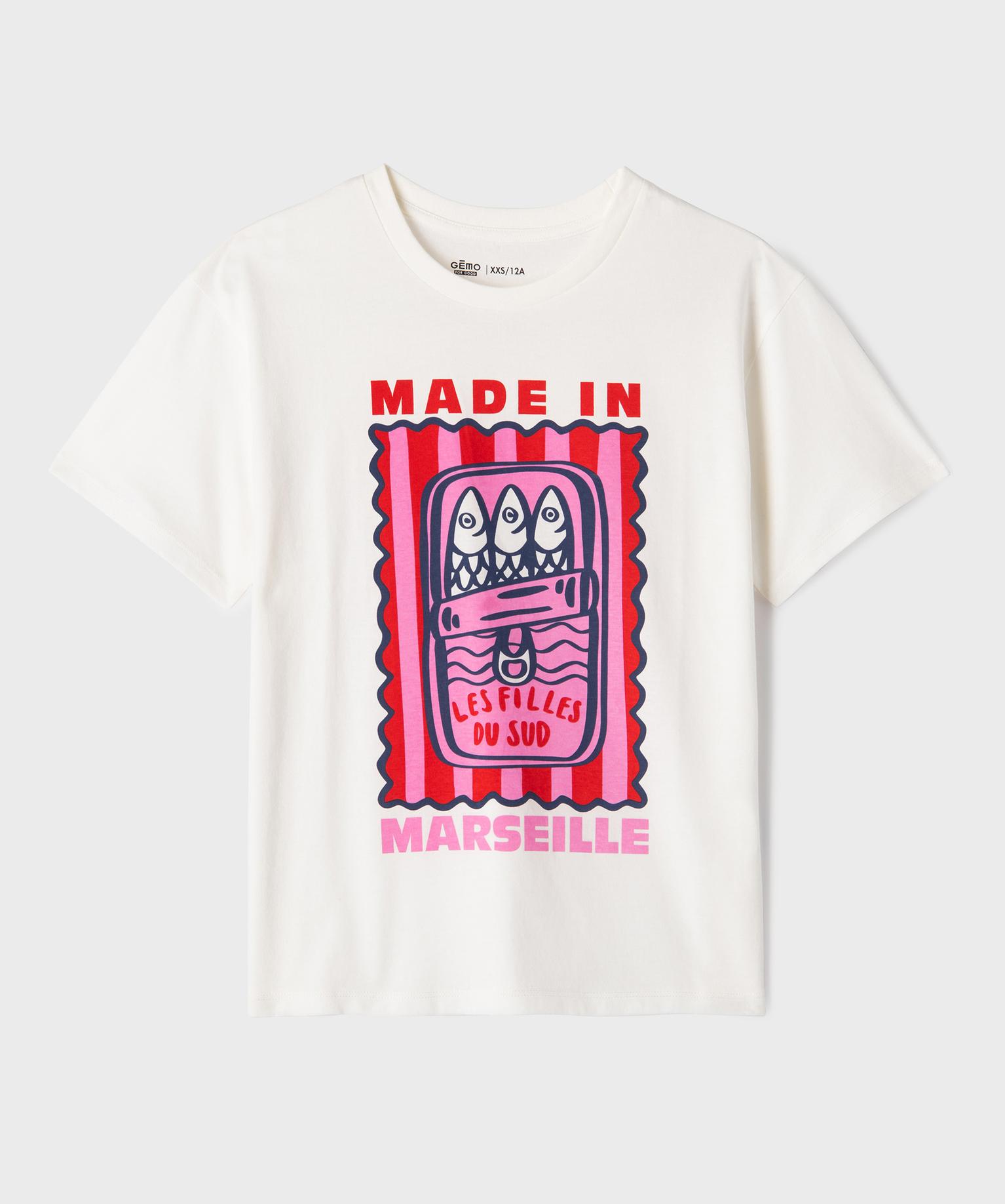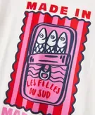 Apportez un esprit "bord de mer" clin d'œil avec ce tee-shirt en jersey de coton doux au look résolument rétro. Le tee-shirt fille se distingue par son grand imprimé coloré représentant une boîte de sardines, traité de façon très graphique. Un clin d'œil stylé au Sud et aux vacances, idéal pour dynamiser un short en jean ou un pantalon blanc. Sa coupe classique et son confort en font l'allié indispensable des filles qui aiment afficher un style unique et audacieux. Col rond en bord-côte. Dos uni.