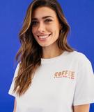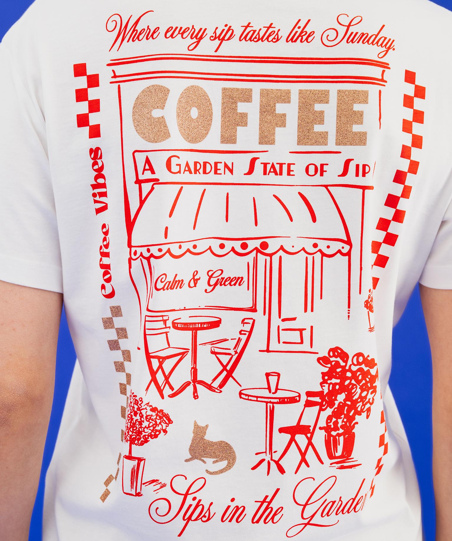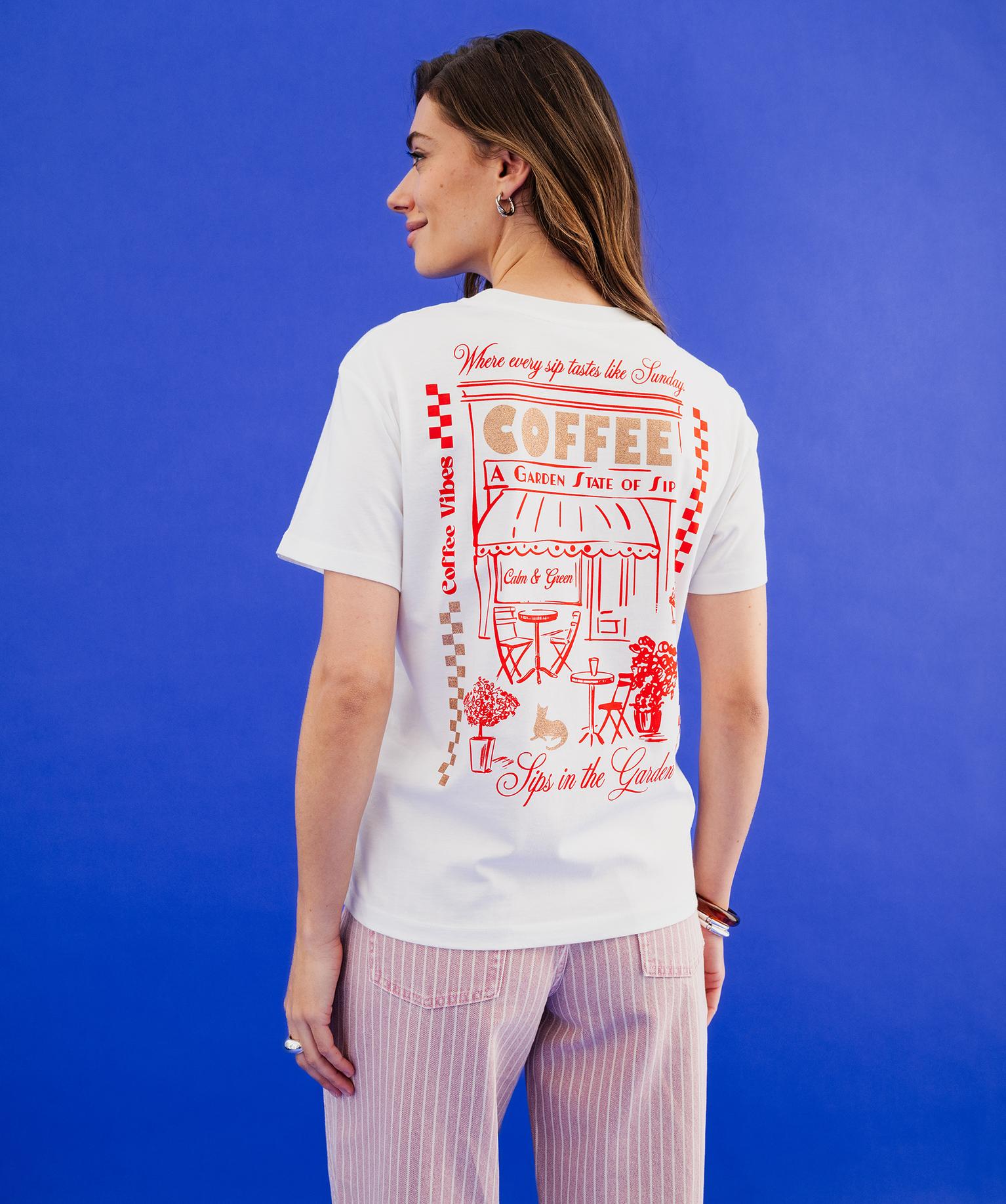 Ce tee-shirt femme en jersey 100 % coton adopte une coupe droite facile à porter au quotidien. Il se distingue par son jeu d’imprimés très graphiques avec un petit motif placé sur la poitrine et un grand visuel assorti au dos, dans un esprit illustration. Décliné en différents motifs et coloris, toujours autour de l’univers du café, ce chouette tee-shirt apporte une vraie touche créative et originale à vos tenues casual.