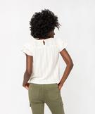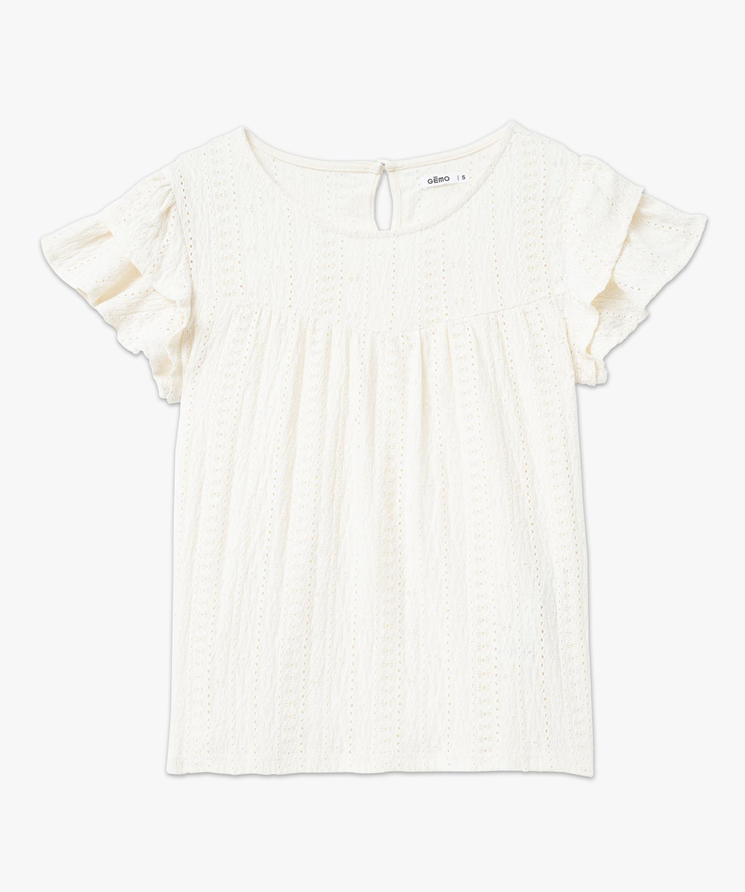 Tee-shirt manches courtes en maille ajourée avec volants femme blanc