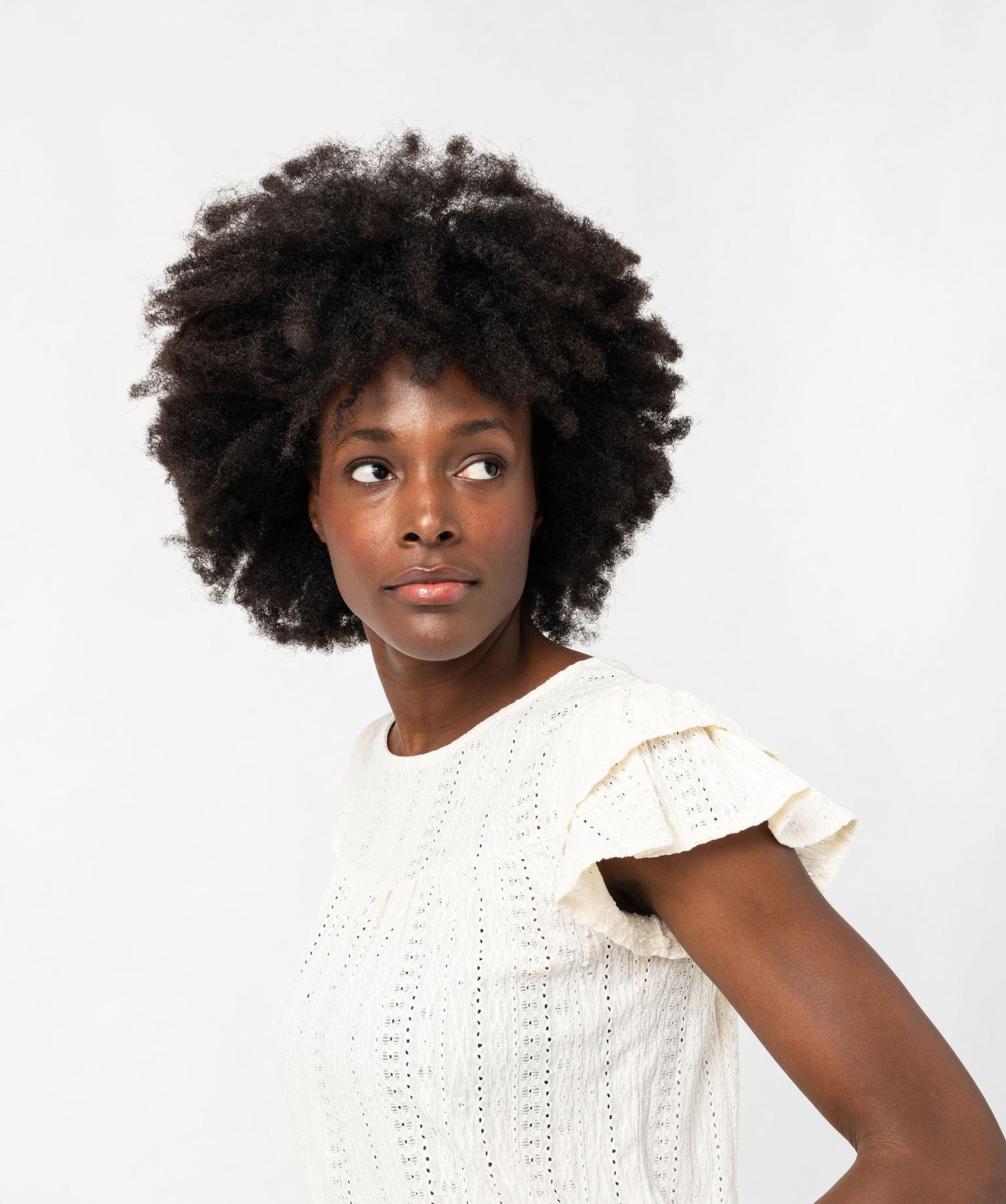 Offrez-vous une allure élégante délicatement teintée de romantisme grâce à ce tee-shirt en maille ajourée doté de volants sur les manches. Un tee-shirt femme avec large col rond permettant de valoriser le décolleté et fermé par un bouton dans le haut du dos avec ouverture goutte. Confectionné dans une maille souple et extensible, ce tee-shirt à manches courtes arbore des fronces au-dessus de la poitrine et dans le dos, assurant un maximum de confort. Il se porte avec un pantalon en toile ou avec un jean et une paire de derbies.