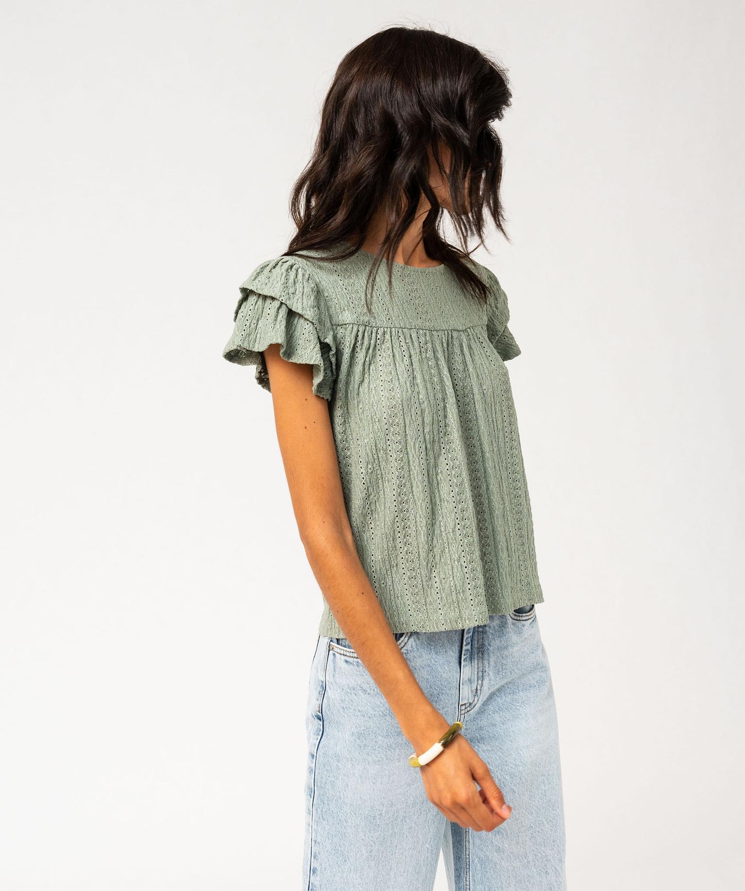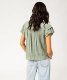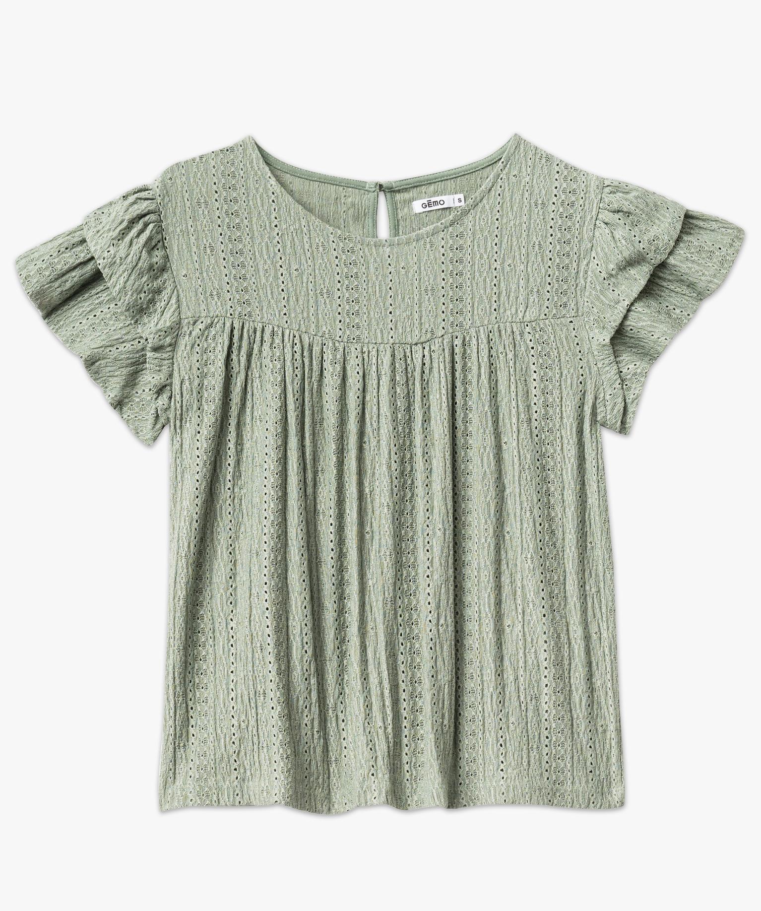 Tee-shirt manches courtes en maille ajourée avec volants femme vert
